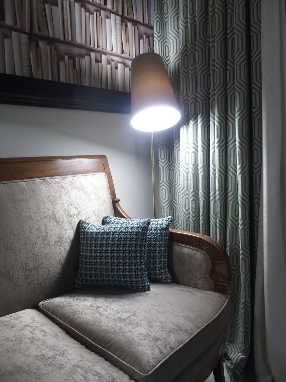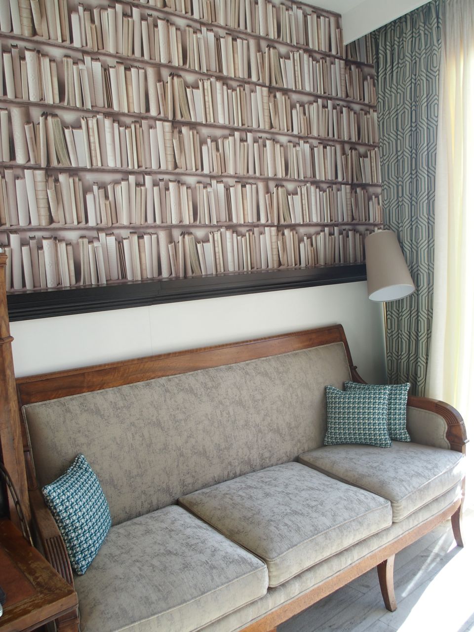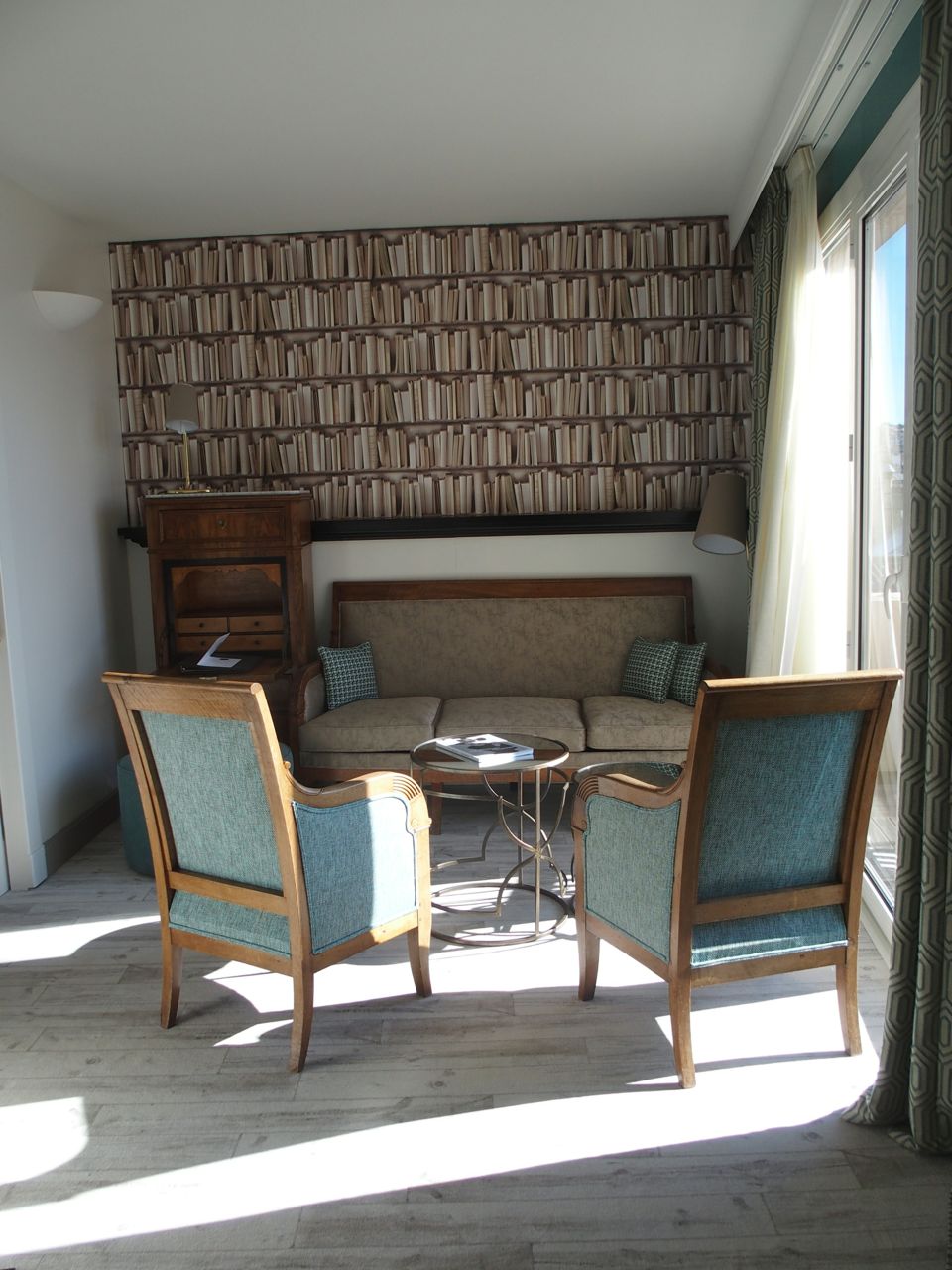 La suite est cosy, tout en étant spacieuse. La décoration mélange papier peint contemporain en trompe l’oeil et mobilier d’époque.