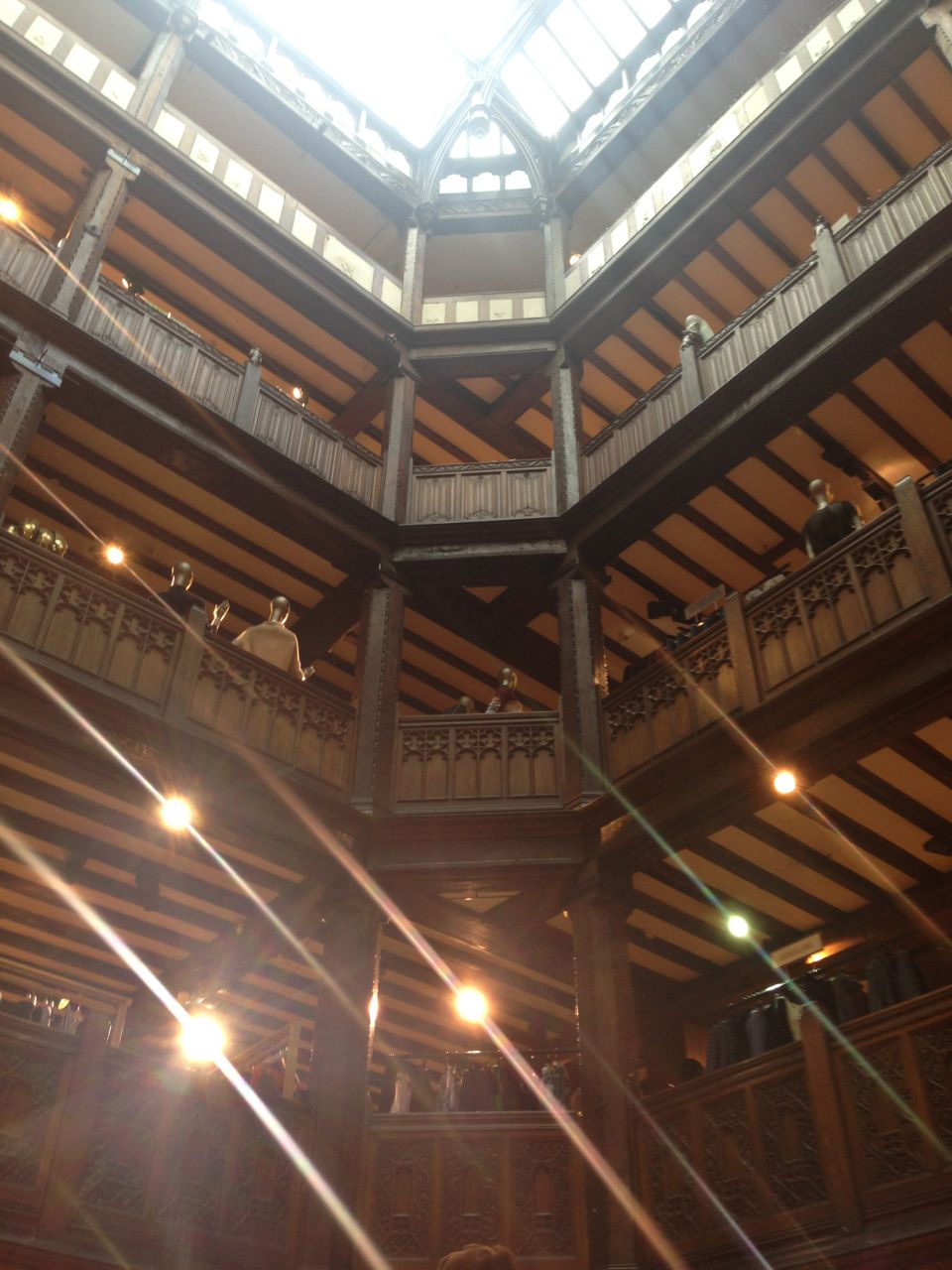 Intégralement construit en bois, à partir du bois de deux navires du négociant qu’était M. Liberty, le grand magasin est conçu autour de 3 puits de lumière, dont celui que vous pouvez voir sur la photo. Vous y trouverez tous les tissus dont vous rêvez, mais aussi un très beau rayon « chaussures » que je vous recommande vivement pendant les soldes !