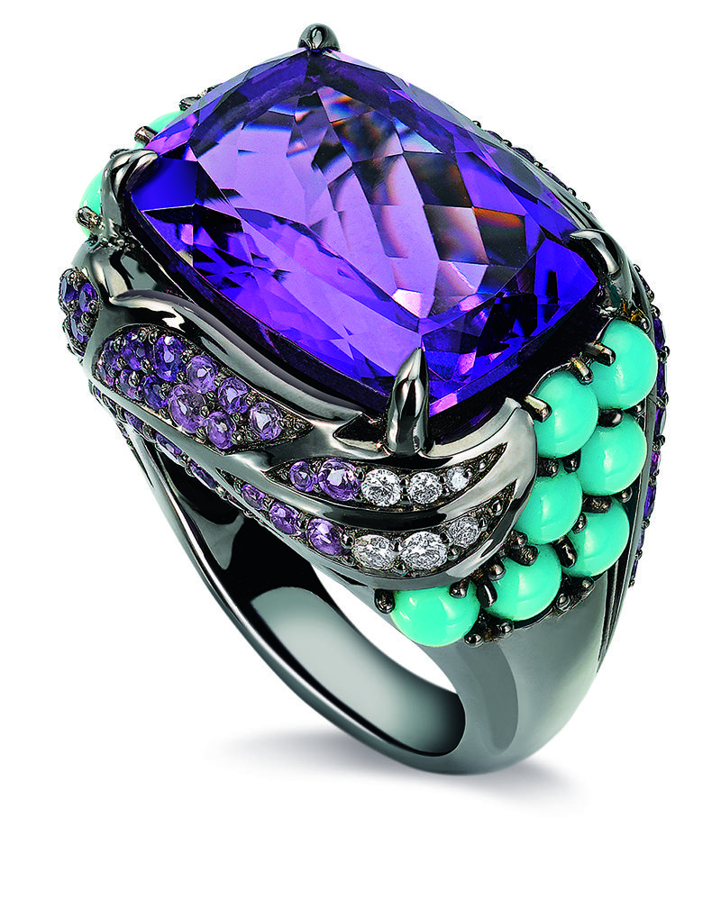 J’irai droit au but en vous montrant la bague pour laquelle j’ai un coup de coeur absolu : les Extravagantes, et plus spécifiquement le modèle en or noir, orné d’une améthyste et de turquoises.