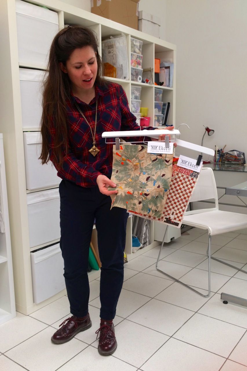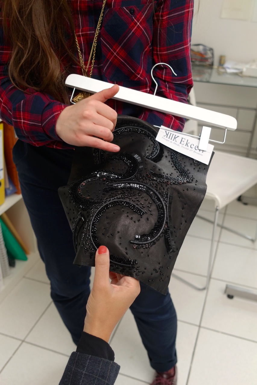 Pour présenter sa marque, Ekceli (Regard braqué en espéranto) et son savoir faire, elle fabrique des échantillons et les propose à ses clients. Du cuir brodé, du cuir en tie and dye. Mais aussi de la broderie d’or, de fils, et tout ce que son imagination et son talent lui autorisent.