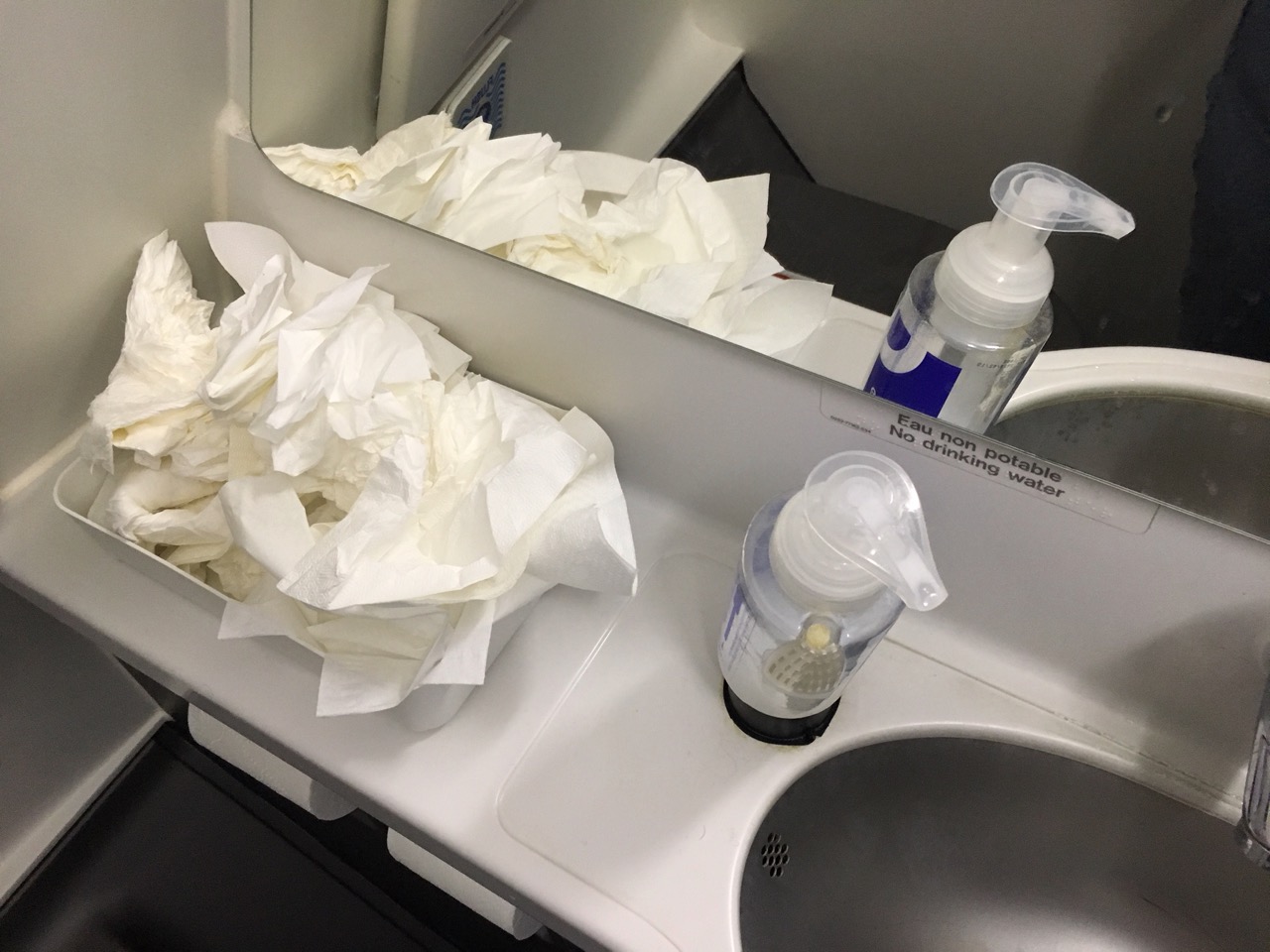 Dans les toilettes, on trouve habituellement une gamme de produits Clarins pour se démaquiller ou se rafraichir. Mais sur le vol AF1621, non seulement pas de produits de soins, mais une poubelle  « INOP » – comprendre sans doute inopérante – donnant lieu à un monceau de papiers usagés entassés pendant tout le vol.