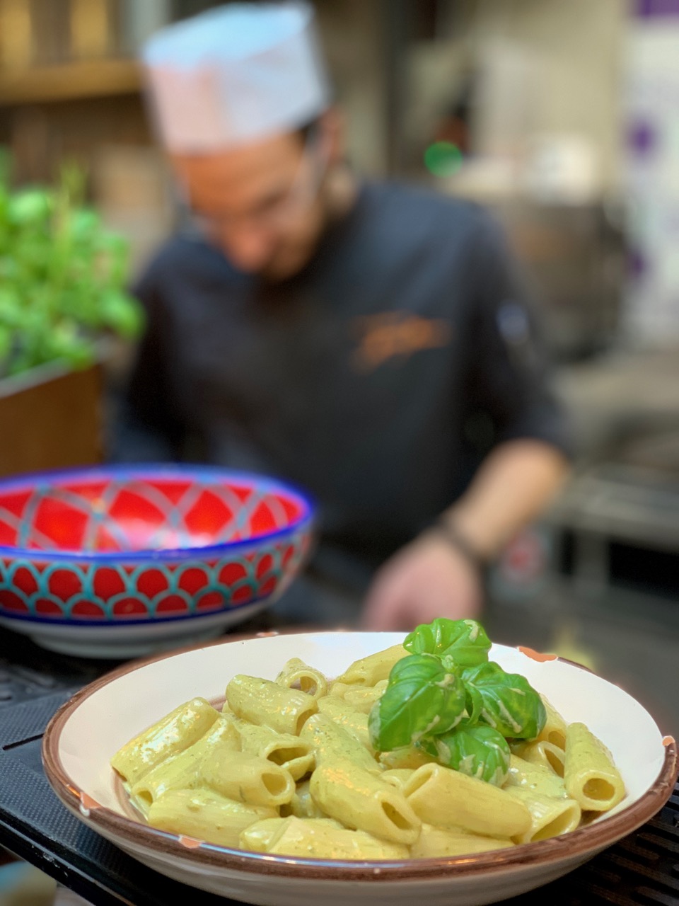 Puis en progressant on découvre finalement les cuisines ouvertes. Le ton est donné, on va se régaler. Chaque détail compte dans ce lieu haut en couleurs, de la moindre plante au choix des assiettes en provenance directe de Sicile.