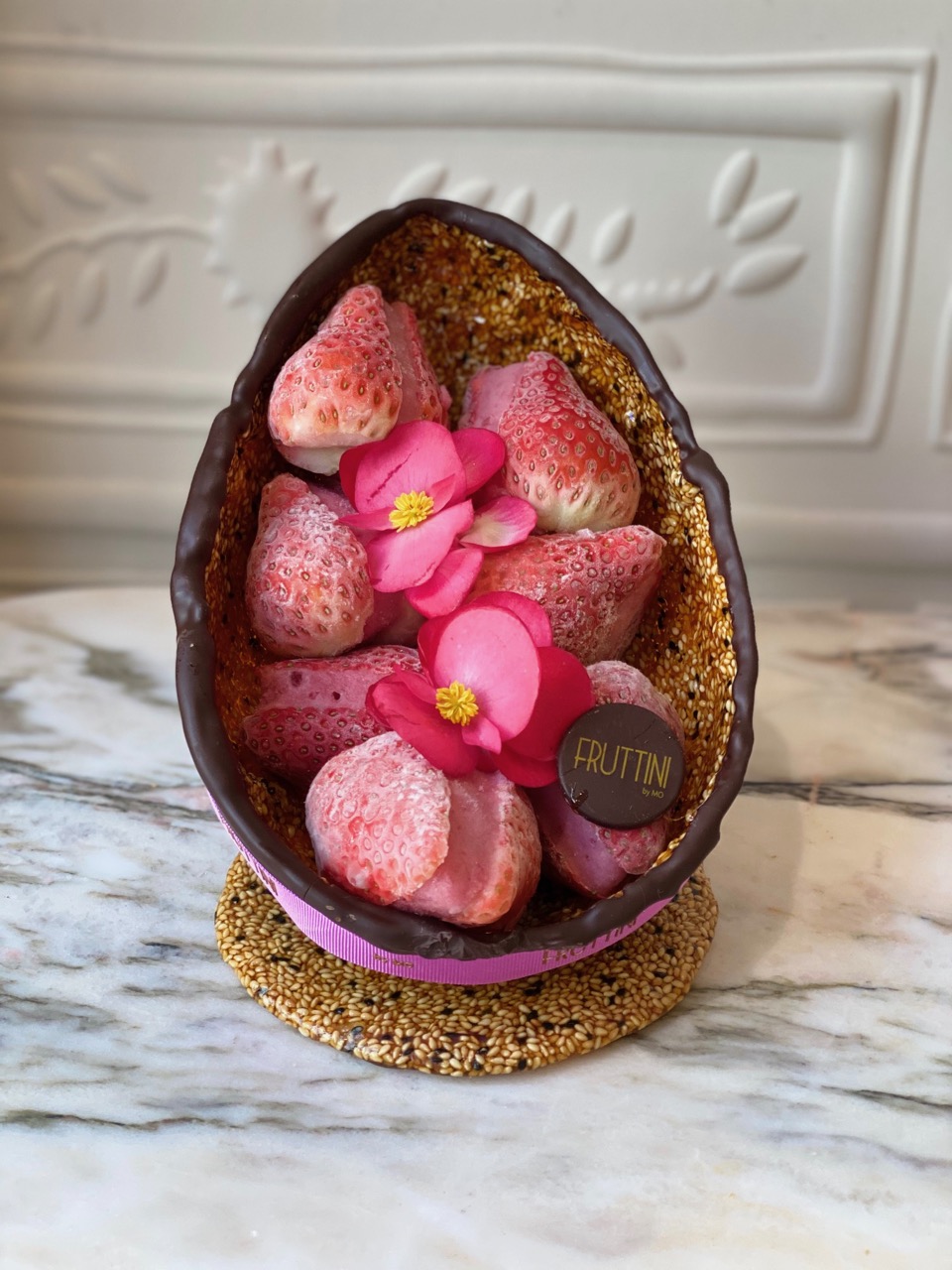 A l’approche des fêtes de Pâques et leurs gourmandises chocolatées, Fruttini réinvente l’oeuf de Pâques. Une demi coquille d’oeuf en nougatine, garnie de délicieuses bouchées givrées.