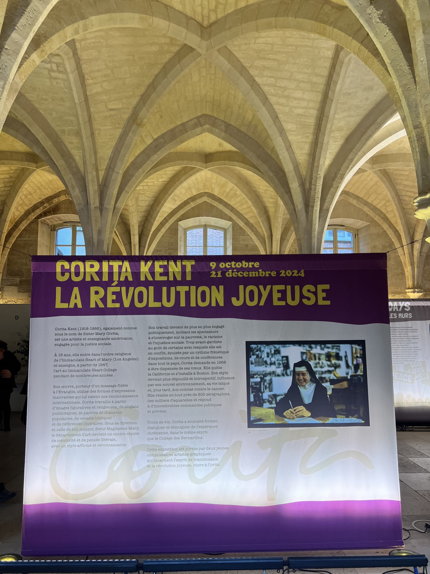 Le collège des Bernardins, joyau de l’architecture cistercienne, est depuis aussi loin qu’on s’en souvienne, un lieu de rencontres, d’échanges intellectuels et culturels. Corita KENT était une femme libre, indépendante, qui n’a pas craint d’affronter les institutions et d’innover tant dans l’art que dans la pensée. C’est donc tout naturellement qu’elle trouve sa place dans cette belle institution avec l’exposition Corita KENT, la révolution joyeuse.