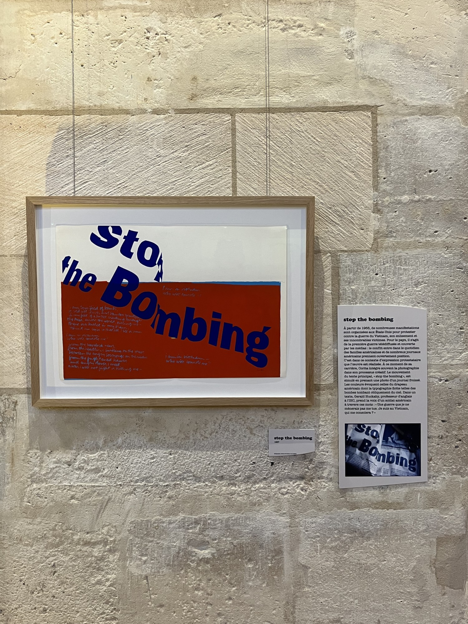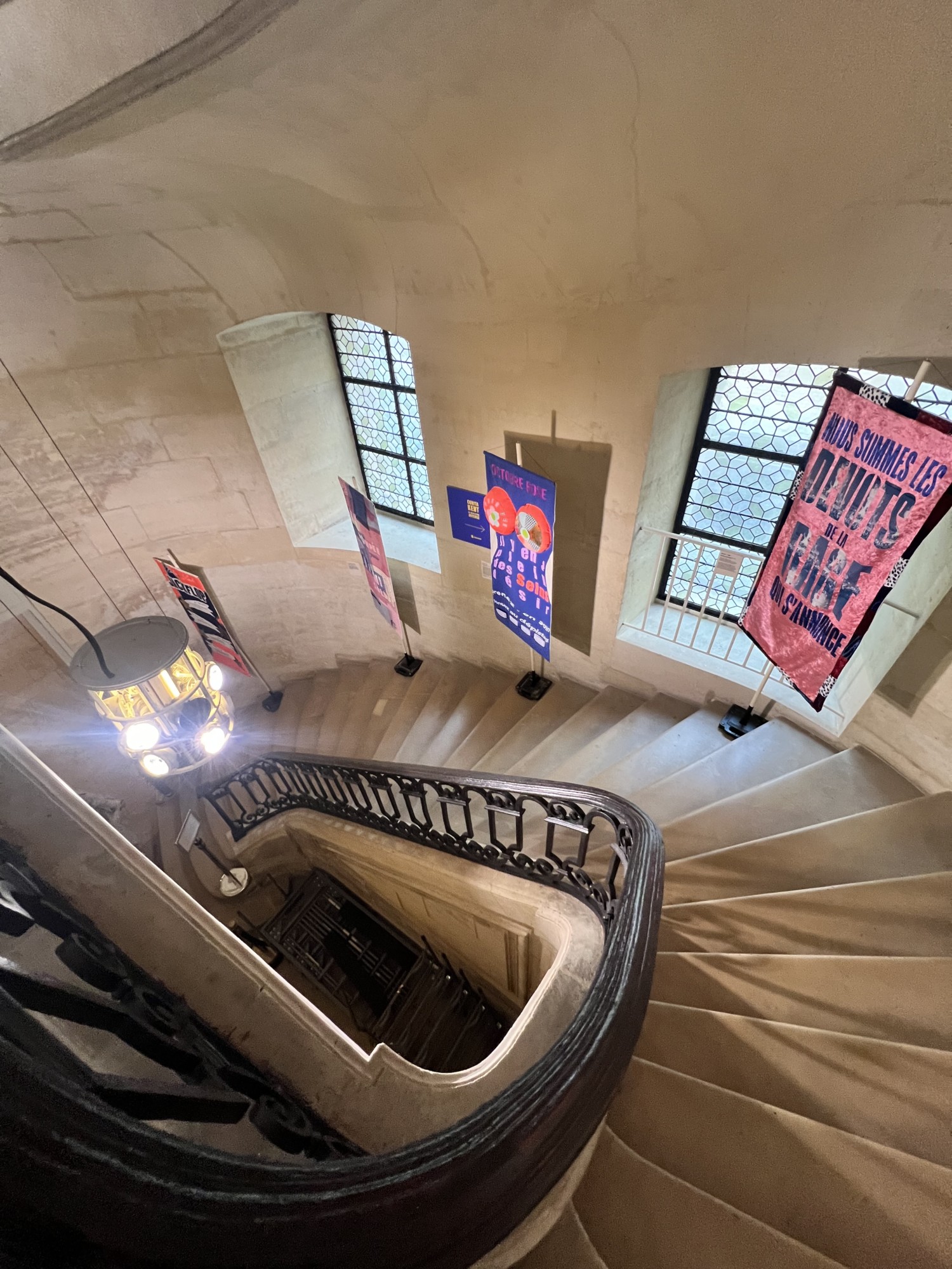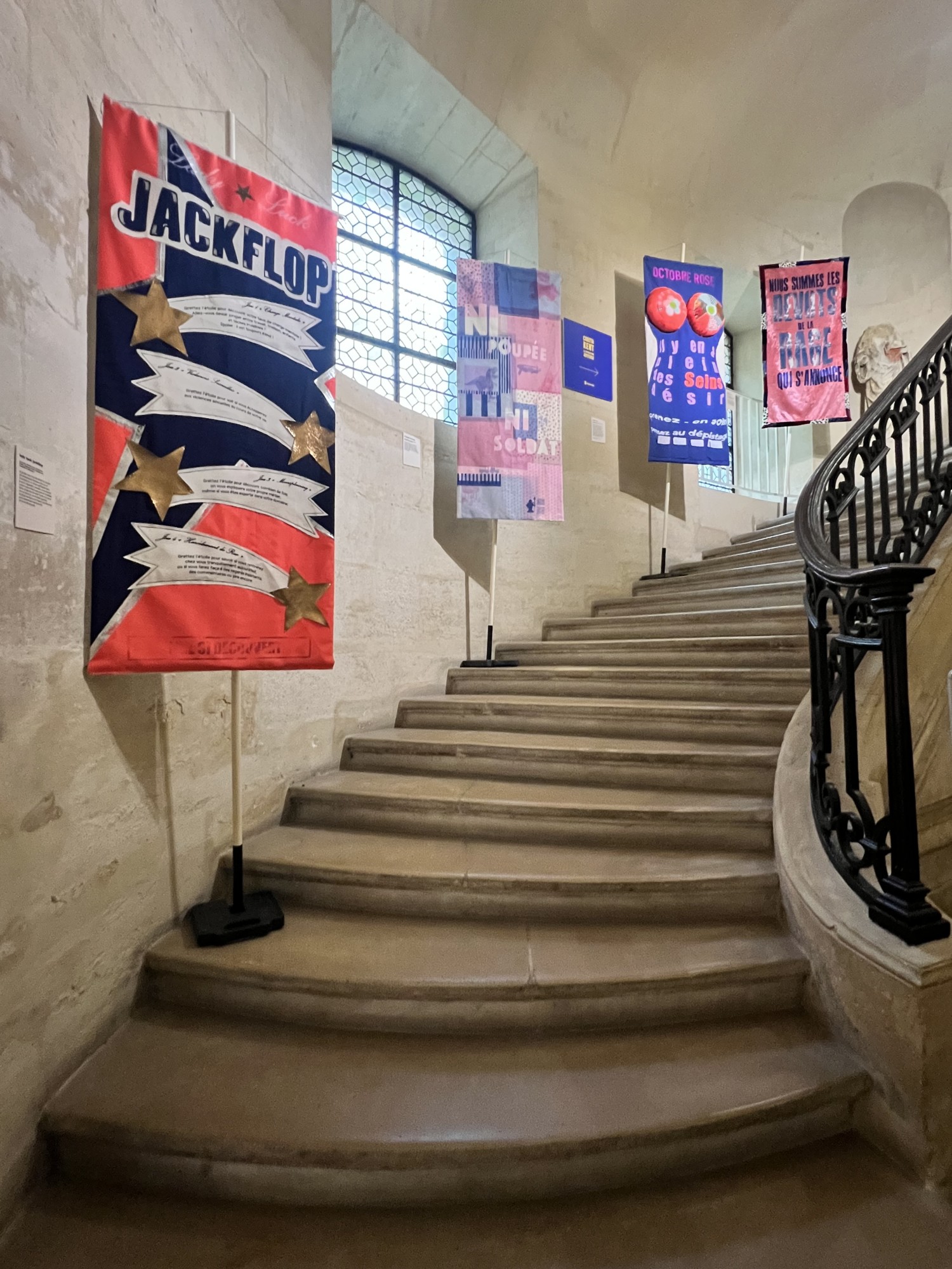 En effet, les oeuvres originales sont exposées dans sacristie, puis dans l’escalier du XVIIIjème, également interdit au public, ce sont les banderoles crées par les élèves de l’école des arts décoratifs pour faire écho à l’œuvre de Corita Kent qui sont installées. Enfin, à l’étage, une sélection effectuée dan les stocks de diapositives de Corita tourne en boucle donant un autre angle de sa vision du monde. Une exposition très riche donc, qui donne un aperçu du foisonnement de ce que fut la création de Corita Kent.