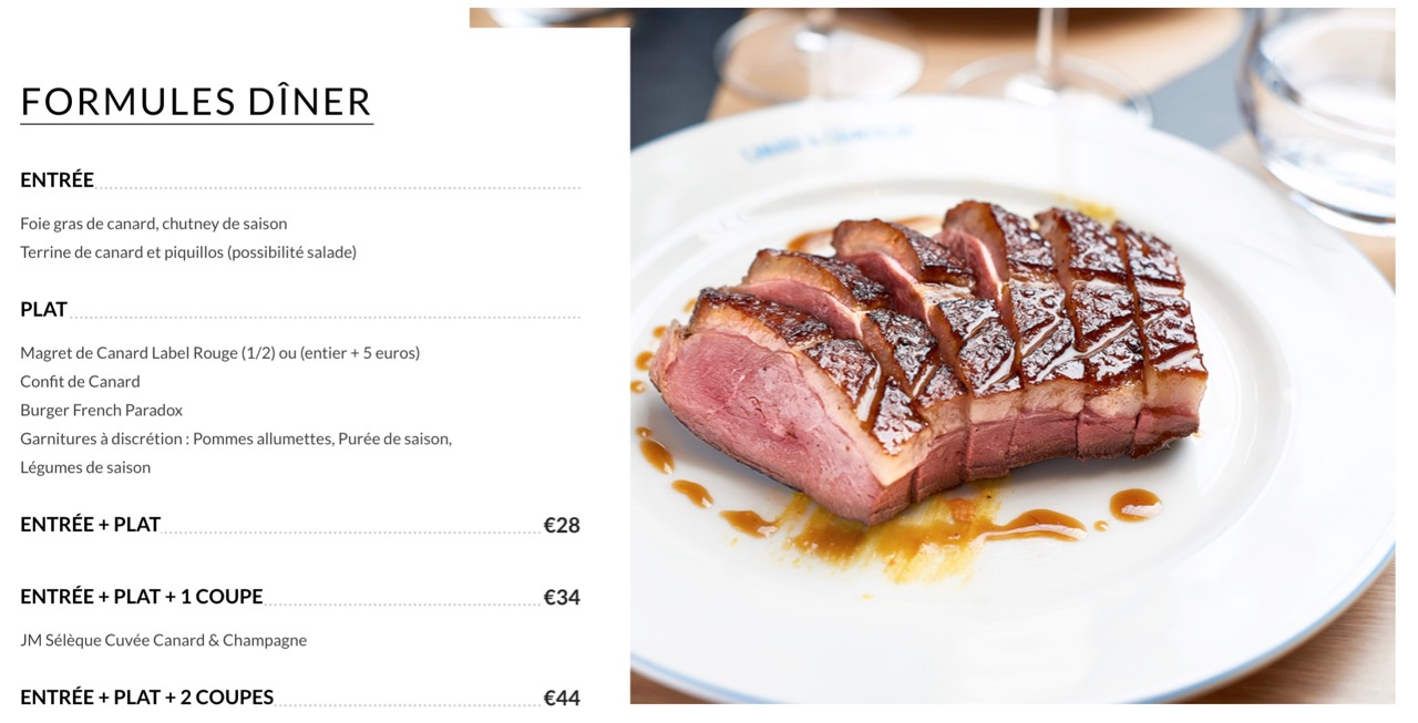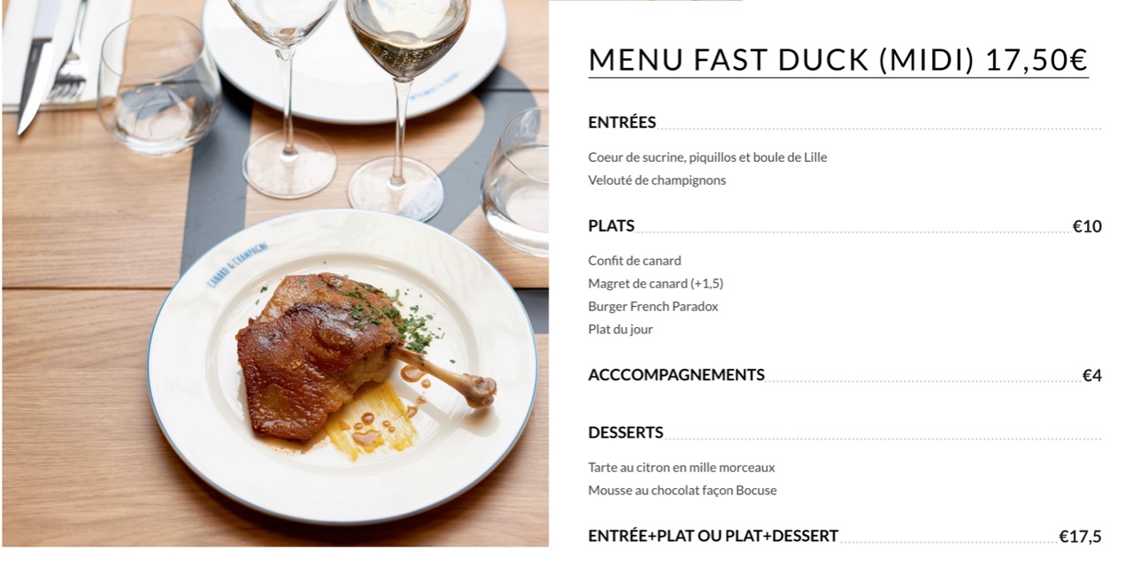 Trois entrepreneurs à la tête de cette adresse qui propose l’association d’un des plats préférés des français avec la boisson préférée du monde entier ! Ceux qui n’aiment pas le canard peuvent passer leur chemin. Pour les autres, attardons nous un instant sur les propositions très alléchantes de la carte.