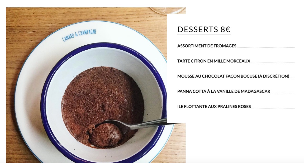 J’aime tout particulièrement le concept du « Fast duck« , pour un déjeuner rapide et efficace. Mais le clou de cette carte sera pour moi l’ile flottante aux pralines roses, mon dessert favori au monde depuis toujours ! Il ne me reste donc plus qu’à tester.