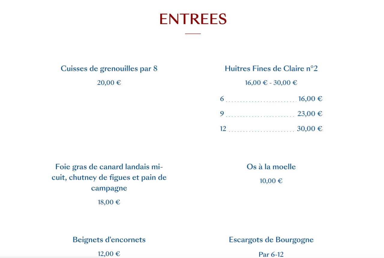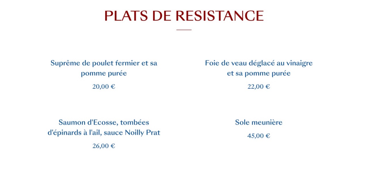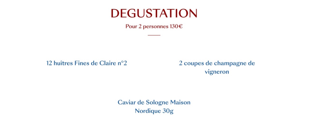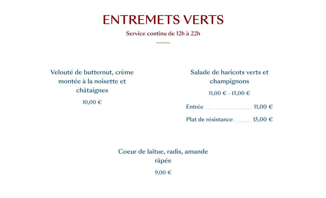 On retrouve le traditionnel semainier, avec des grands classiques de la brasserie parisienne. Filet de boeuf, poulet rôti ou encore cuisses de grenouilles. Mais surtout une proposition par assiette dans plusieurs catégorie : végétaux, mer, terre et douceurs. Dans tous les cas, de beaux produits, sélectionnés avec soin, et surtout la liberté de se régaler comme on le souhaite ! Pourquoi ne pas choisir deux assiettes de la mer, ou encore une de végétaux puis une de douceurs !