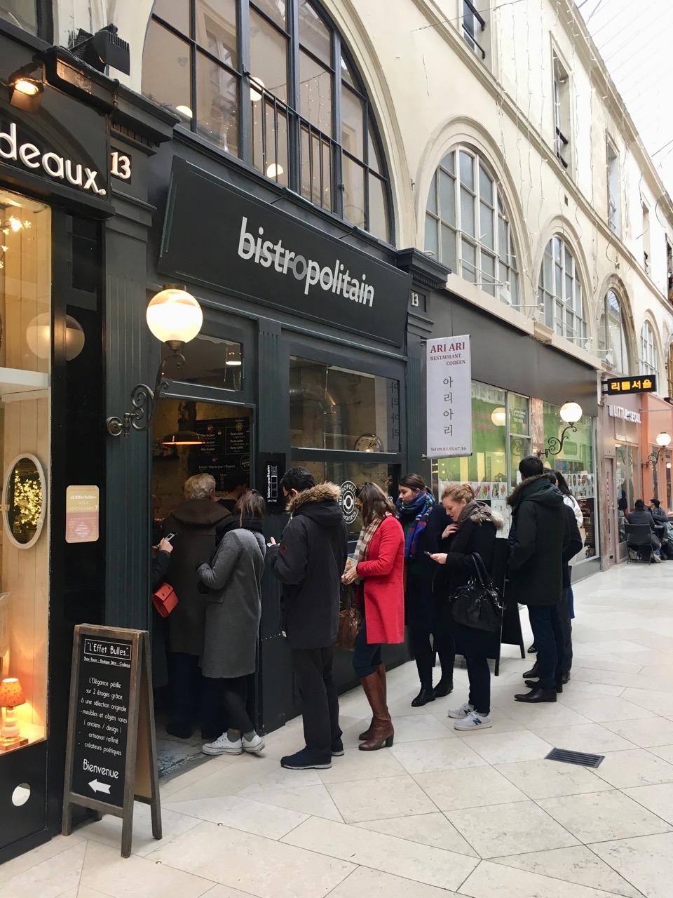 Bistropolitain semble être la preuve que l’on peut se régaler d’un bon petit plat cuisiné pour le déjeuner. La file d’attente continue pendant les deux heures d’ouverture est un indice indéniable du succès de cette adresse dont le parmentier de canard proposé ce jour en plat du jour emplissait le passage de ses délicieux fumets.
