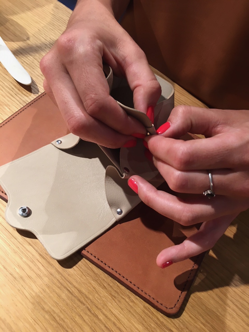 Elle aime partager sa passion du cuir, sa passion du geste, et c’est pour ces raisons qu’elle propose désormais des ateliers pour permettre à chacune de créer une pochette en cuir à son image, dans les couleurs de son choix.