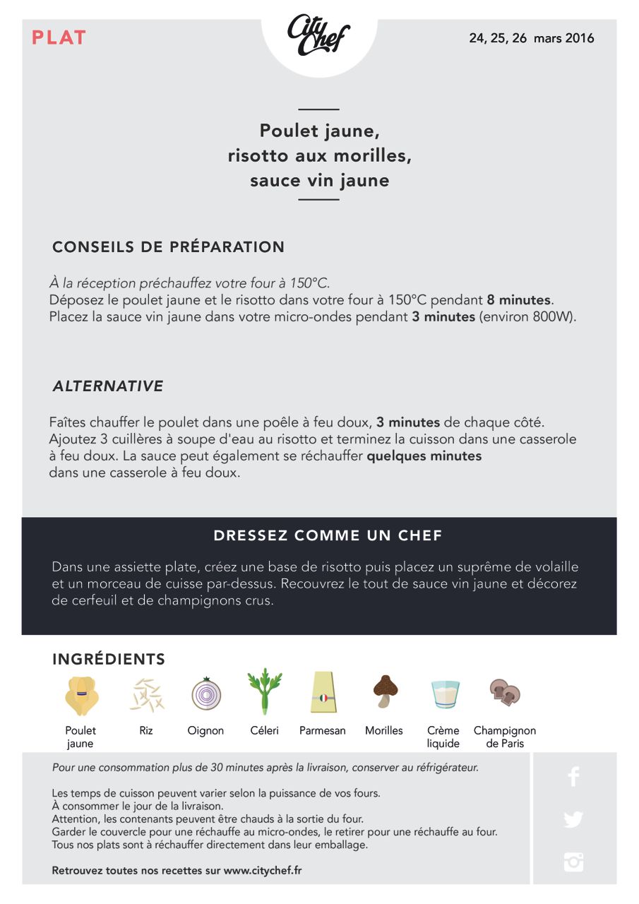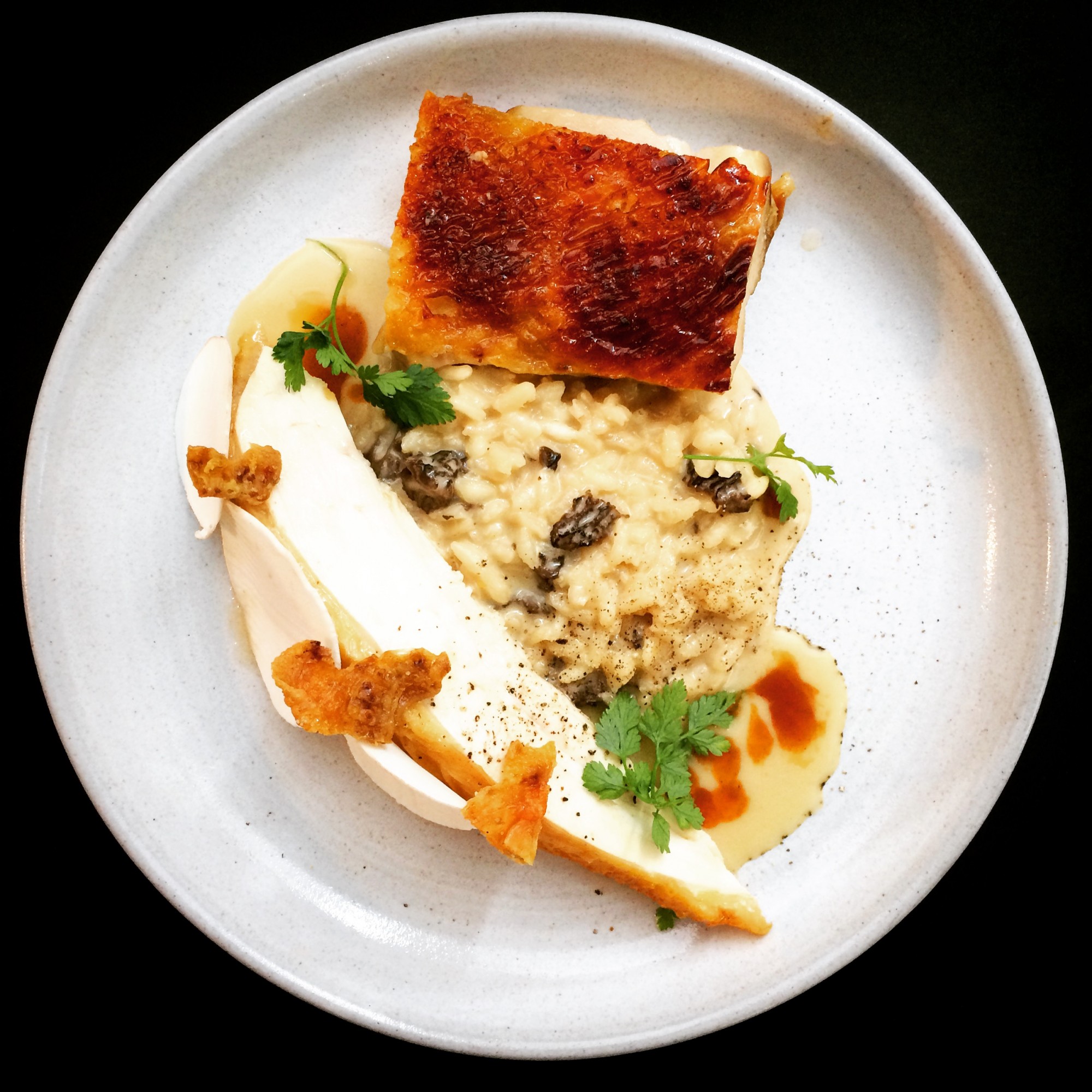 Plat : Poulet jaune, risotto aux morilles, sauce vin jaune