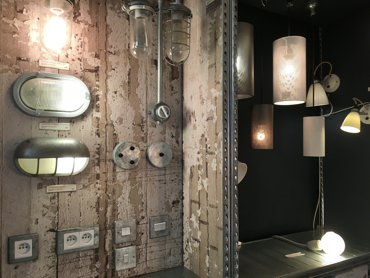 On y trouve des objets de décoration, des luminaires dans la lignée de la tendance du moment – ampoules filaments, appliques industrielles.