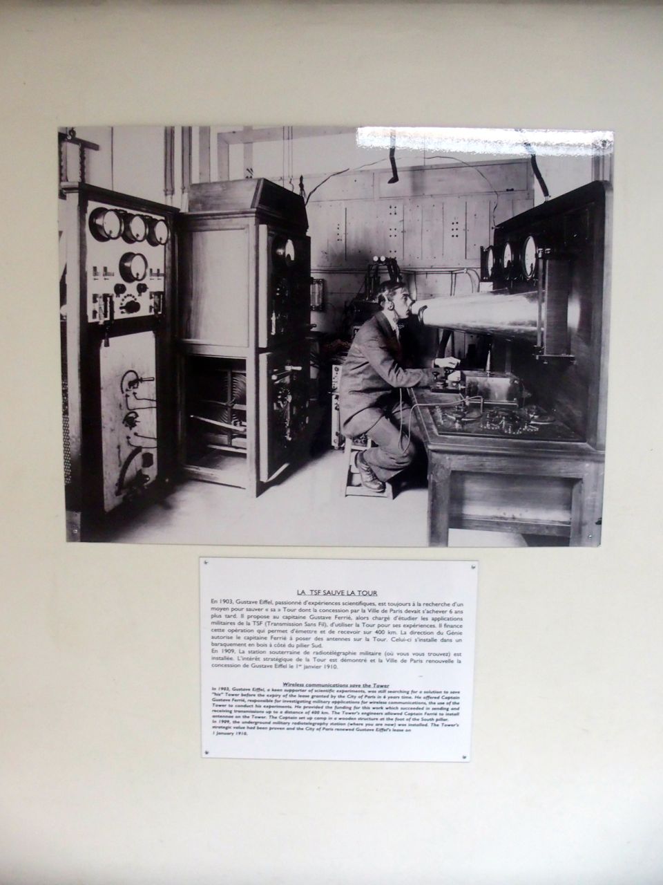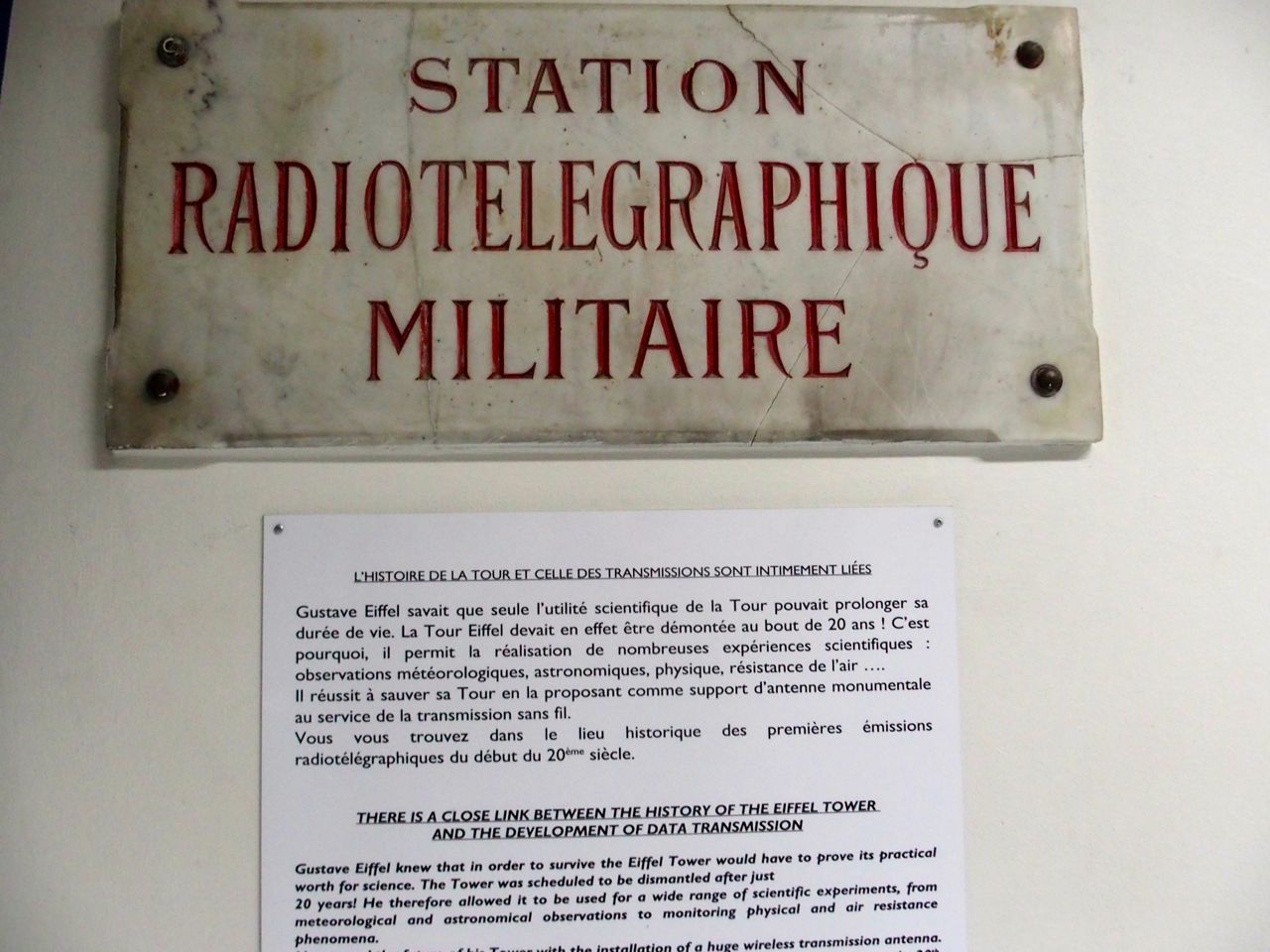 Destinée à durer seulement 20 ans, ce sont les expériences scientifiques qu’Eiffel favorisa et en particulier les premières transmissions radiographiques, puis de télécommunication qui la sauvèrent. Signaux radio de la Tour au Panthéon en 1898, poste radio militaire en 1903, première émission de radio publique en 1925 avec Yvonne Printemps et son mari Sacha Guitri, puis la télévision jusqu’à la TNT plus récemment.