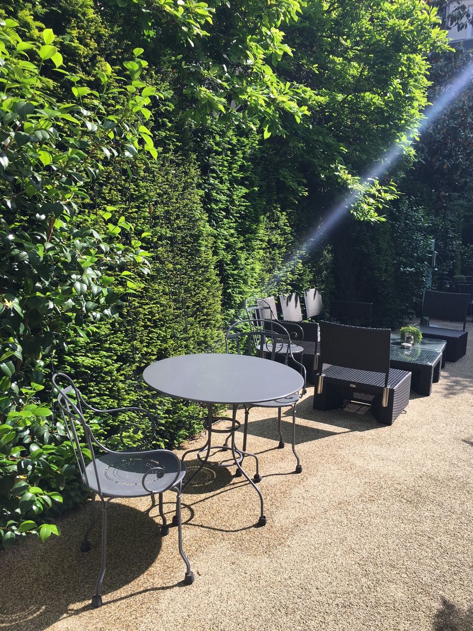 Une cour jardin que l’on ne fait que deviner quand on passe devant l’entrée, et qui s’avère être un superbe havre de paix, un de ces bijoux parisiens que l’on découvre parfois par hasard, quelques fois parce que quelqu’un nous en a confié l’adresse : lucky you, cette fois c’est moi qui vous dévoile ce lieu précieux !