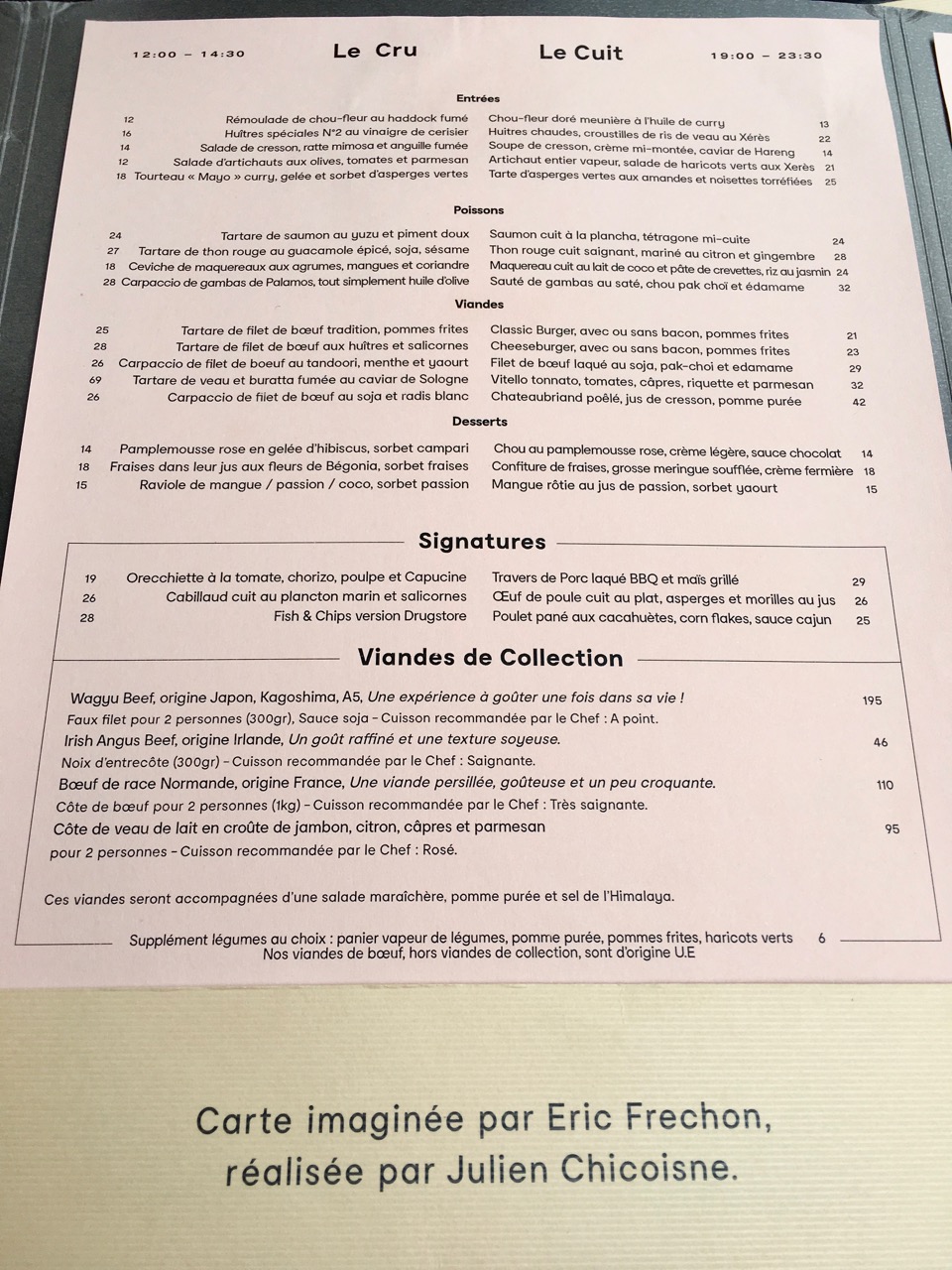 Dans les cuisines, Eric Frechon, déjà à la tête de plusieurs restaurants dont l’Epicure triplement étoilé de l’hôtel Bristol. Enfin, quand je dis « dans les cuisines », je m’emporte. En effet, il a « imaginé » la carte, laissant le soin à d’autres de la mettre en oeuvre. Le parcours d’un chef qui finit par devenir une marque et un chef d’entreprise. D’autres noms viennent d’ailleurs à l’esprit sur ce modèle. Passons.