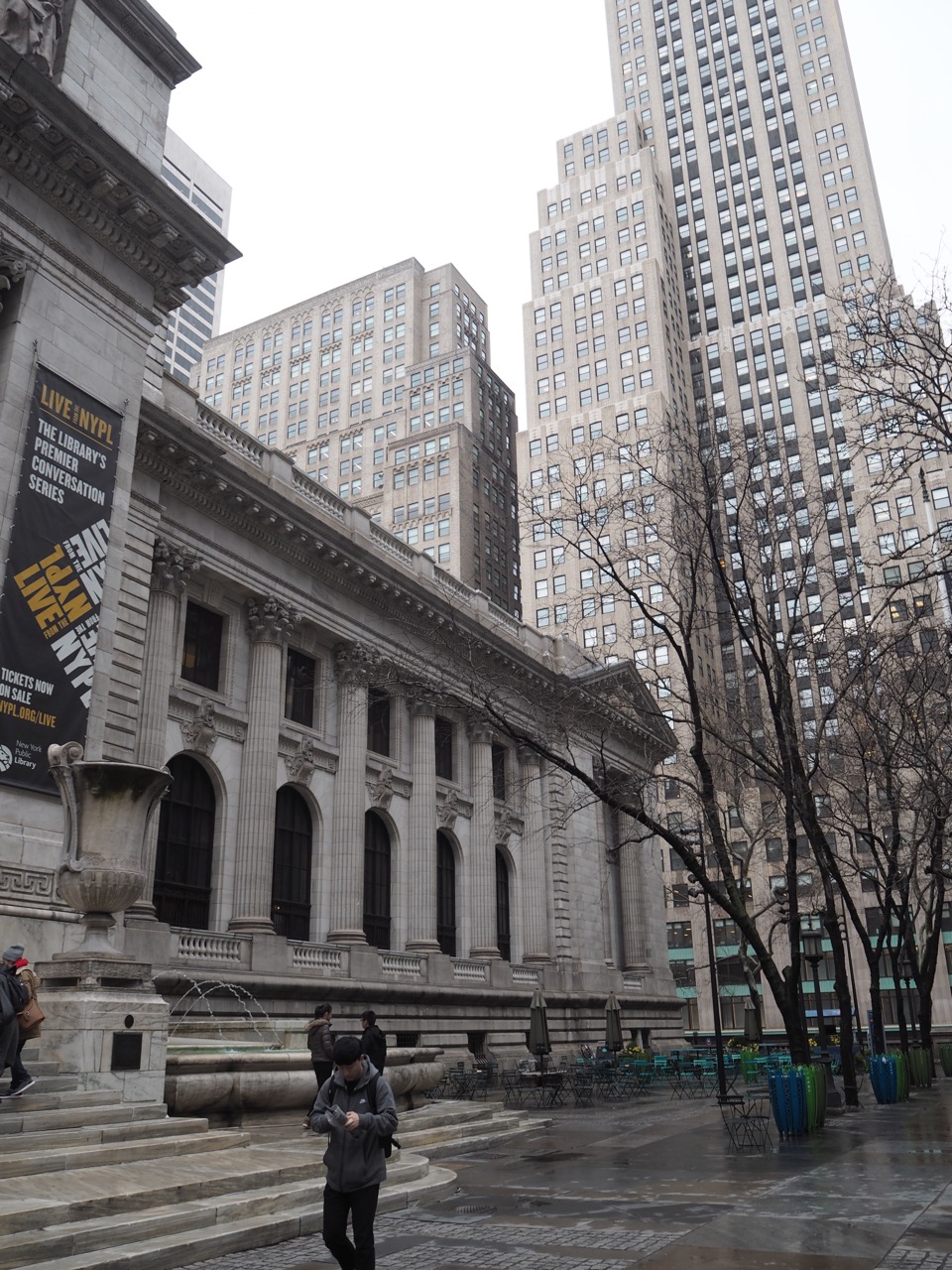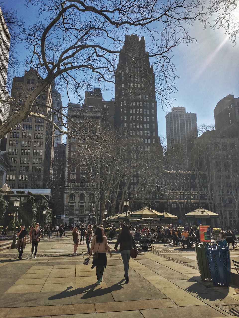 Personnellement commencer un séjour à New York passe par quelques incontournables. Time Square, la cinquième avenue, Central Park en font partie. C’est donc ce que nous avons fait en cette première journée, qui a eu la bonté de nous offrir soleil et douceur dès la descente de l’avion. Et puis il y a Bryant Park, devant la New York Public Library. Ce genre de parc qui n’existe pas à Paris. Des centaines de chaises à disposition, des kiosques pour se désaltérer ou se nourrir, des zones dédiées aux jeux type échecs, dames ou dominos. Un havre de paix au coeur de l’agitation citadine, ouvert du matin jusqu’à la nuit, sans grilles ni portes closes qui en interdiraient l’accès. Les New-Yorkais l’adorent, et moi aussi !