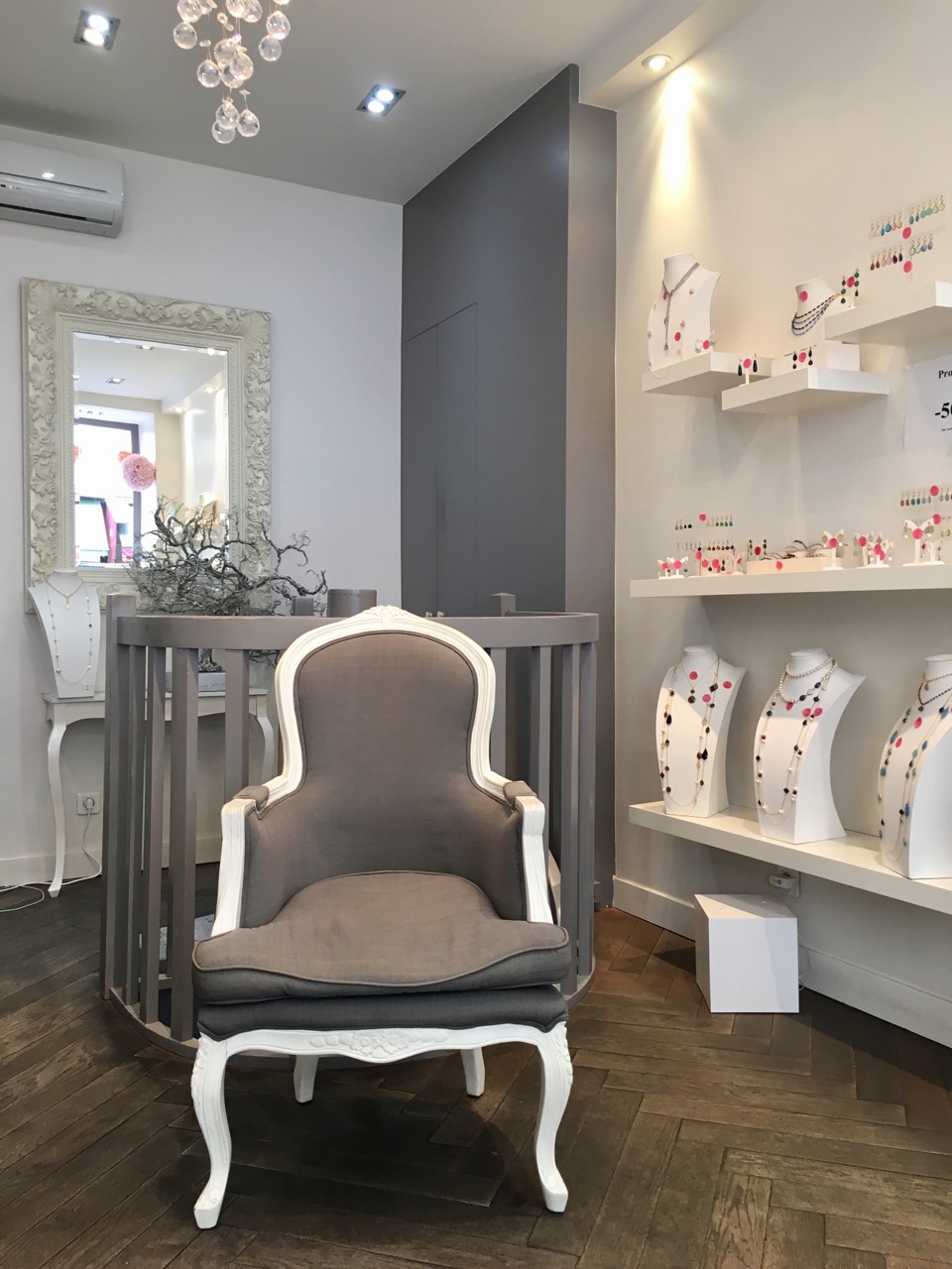 Delphine créé de délicats bijoux ornés de pierres aux couleurs subtiles. Chaque bracelet, chaque paire de boucles d’oreille, chaque pendentif et chaque sautoir est monté dans son atelier de la boutique rue du Bac. La proposition est très large, mais elle pourra l’adapter à votre goût et vos envies si toutefois la couleur de vos rêves n’était pas disponible. De jolis bijoux fantaisie à des prix doux, pour toutes les envies.
