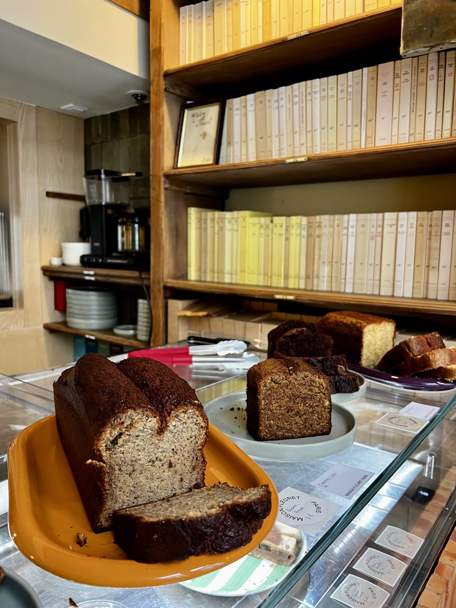 Dans la salle basse, un comptoir ou l’on peut commander un café, un cake ou une pâtisserie maison. On peut également déjeuner. Il suffit de passer commande et de s’installer confortablement.