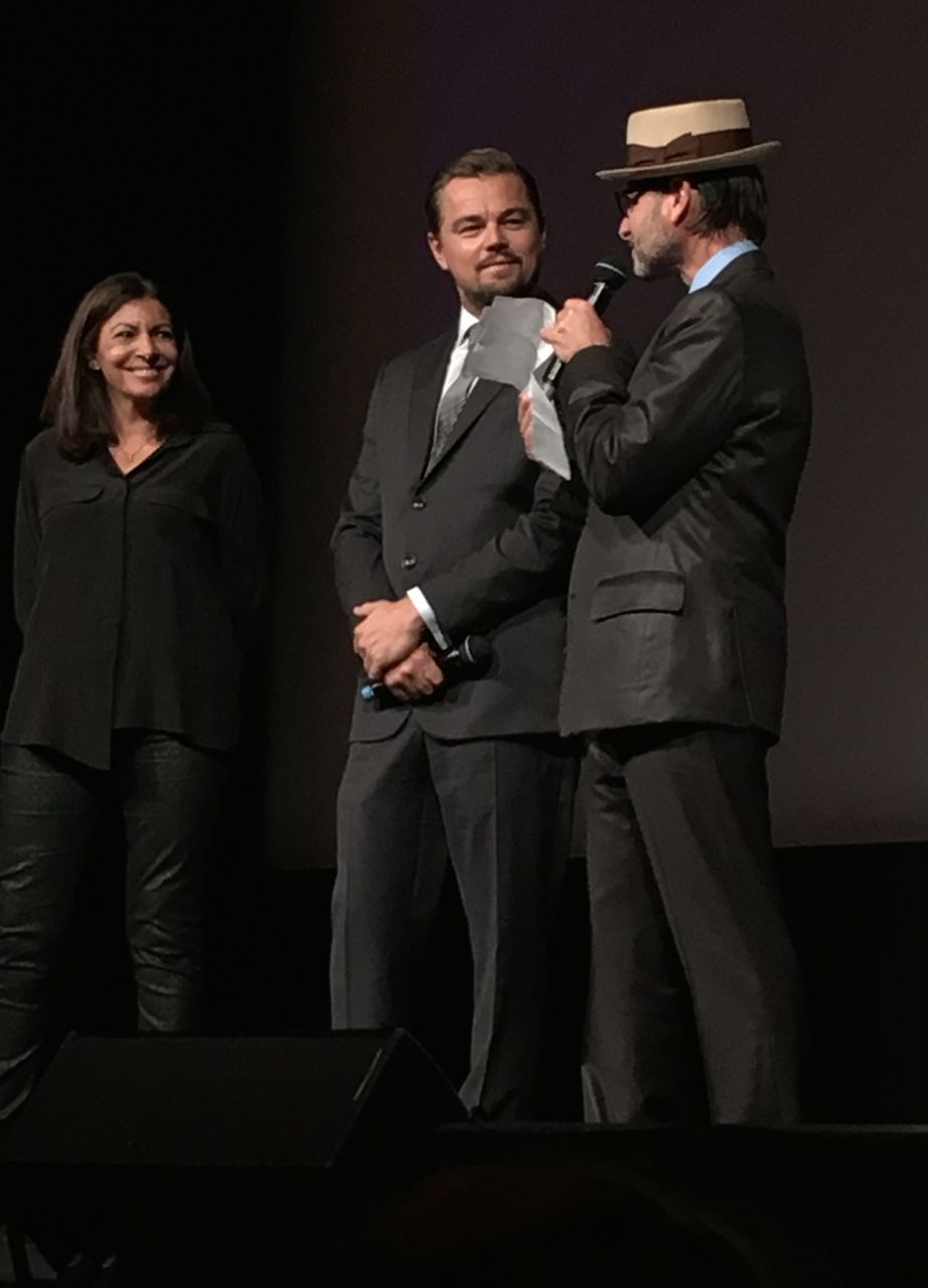 Il est debout, au premier balcon du théâtre du Châtelet, surplombant la salle comble qui applaudit, et on l’imagine hurler, face aux éléments qui se déchaînent : « je suis le roi du monde ! » Mais ce soir, c’est un monde qui va mal que Leonardo DiCaprio est venu nous montrer. Un monde dont nous ne sommes plus les rois, mais les mauvais démiurges.