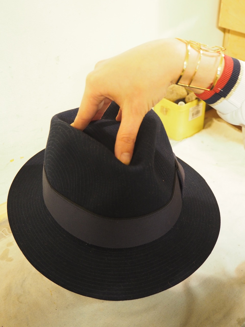 Son atelier, dissimulé au fond d’une courette pavée, est so parisien. Sur les étagères sont alignées les formes en bois . Le conformateur trône sur l’établi, intrigant tous ceux qui ignoraient jusqu’à son existence. Des Fedora ornent les murs, démontrant ainsi la diversité des possibilités de teintes, formes et finitions. Au cœur de Paris, l’emplacement de son atelier lui permet d’accéder aisément à ses fournisseurs favoris. Shindo pour les rubans dans le 2ème ou encore Ultra mode, une charmante mercerie d’époque à deux pas du métro 4 septembre.