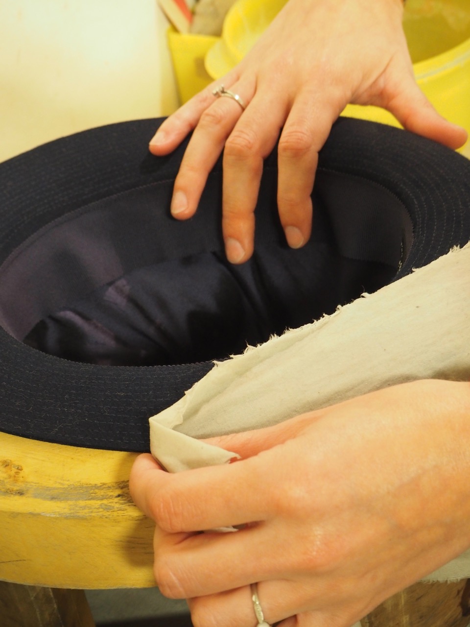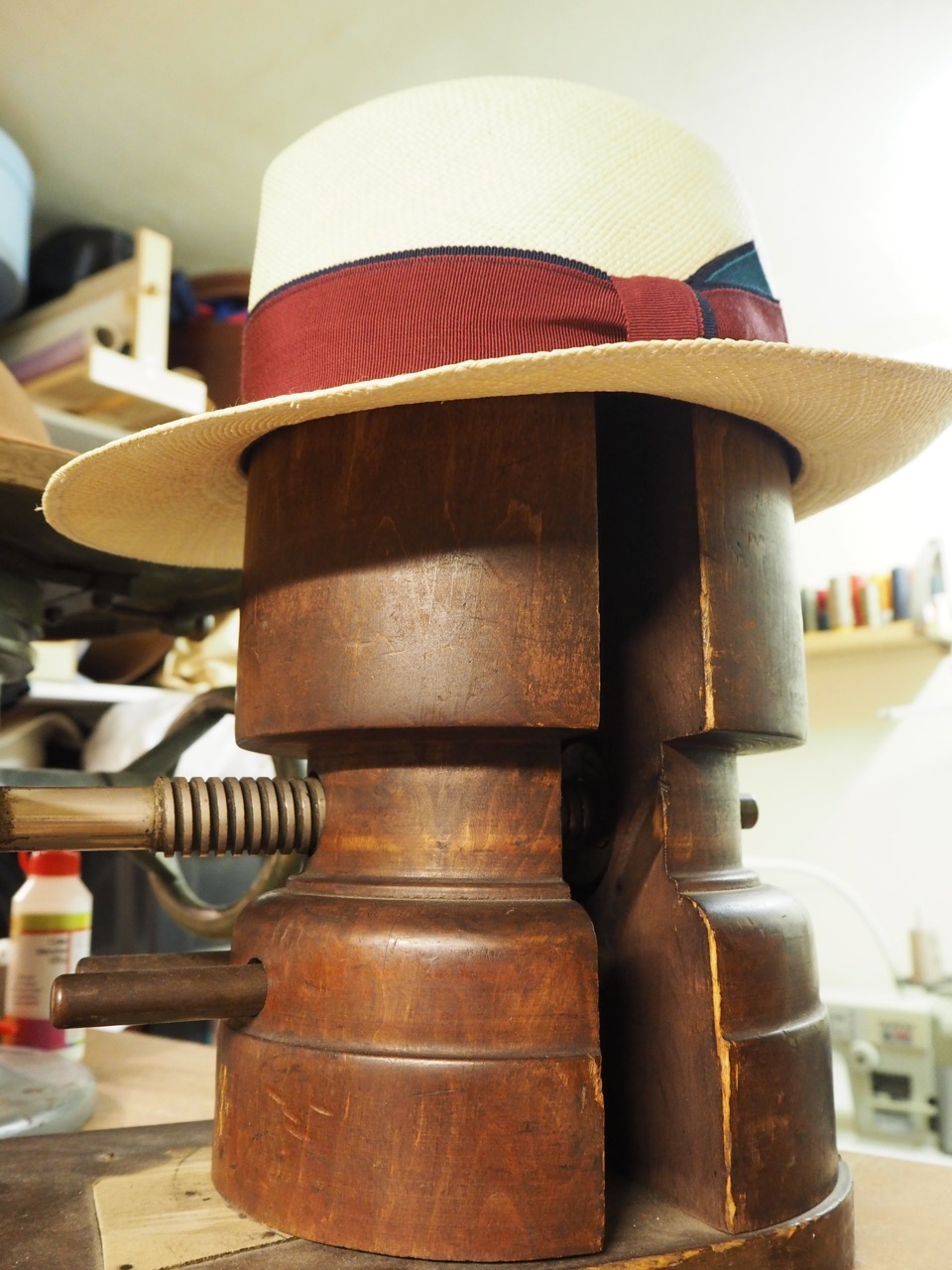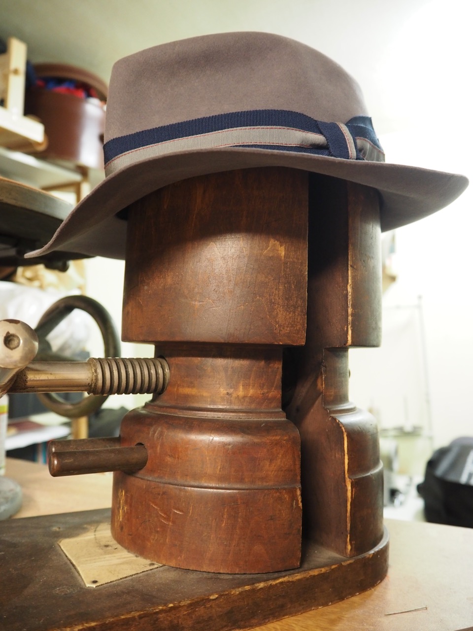 Couleurs sobres ou gros grain coloré, bords plus ou moins larges selon la morphologie de celui qui le portera, il s’agit principalement d’un chapeau masculin que les femmes ont commencé à s’approprier. Pour commencer, Pauline échange avec le futur propriétaire pour cerner parfaitement son interlocuteur, sa personnalité, ses attentes, et de créer ainsi son chapeau unique. La confection passe alors par plusieurs étapes. La première, le moulage. Effectué en utilisant une des multiples formes en bois qu’elle possède. La deuxième, celle de l’ajustement, s’effectue avec son instrument le plus précieux qu’elle tient de M. Sebbah : le conformateur . En le posant sur la tête, il permet de relever chaque détail, chaque irrégularité du crâne, pour ensuite façonner le couvre chef parfait.