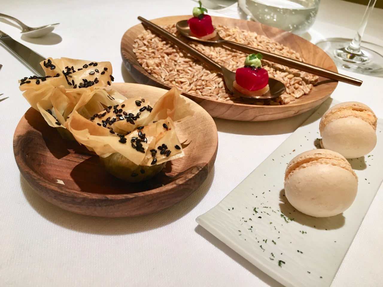 Si je devais désigner un plat favori, ce serait sans hésitation le Thon rouge grillé aux épices Zaatar, légumes glacés aux herbes de Provence, boutargue fumée de Messolonghi, et son jus vert à la cardamome. La chair du thon parfaitement fondante et pourtant ferme, relevée par les épices méditerranéennes, adoucie par son jus vert : un délice !