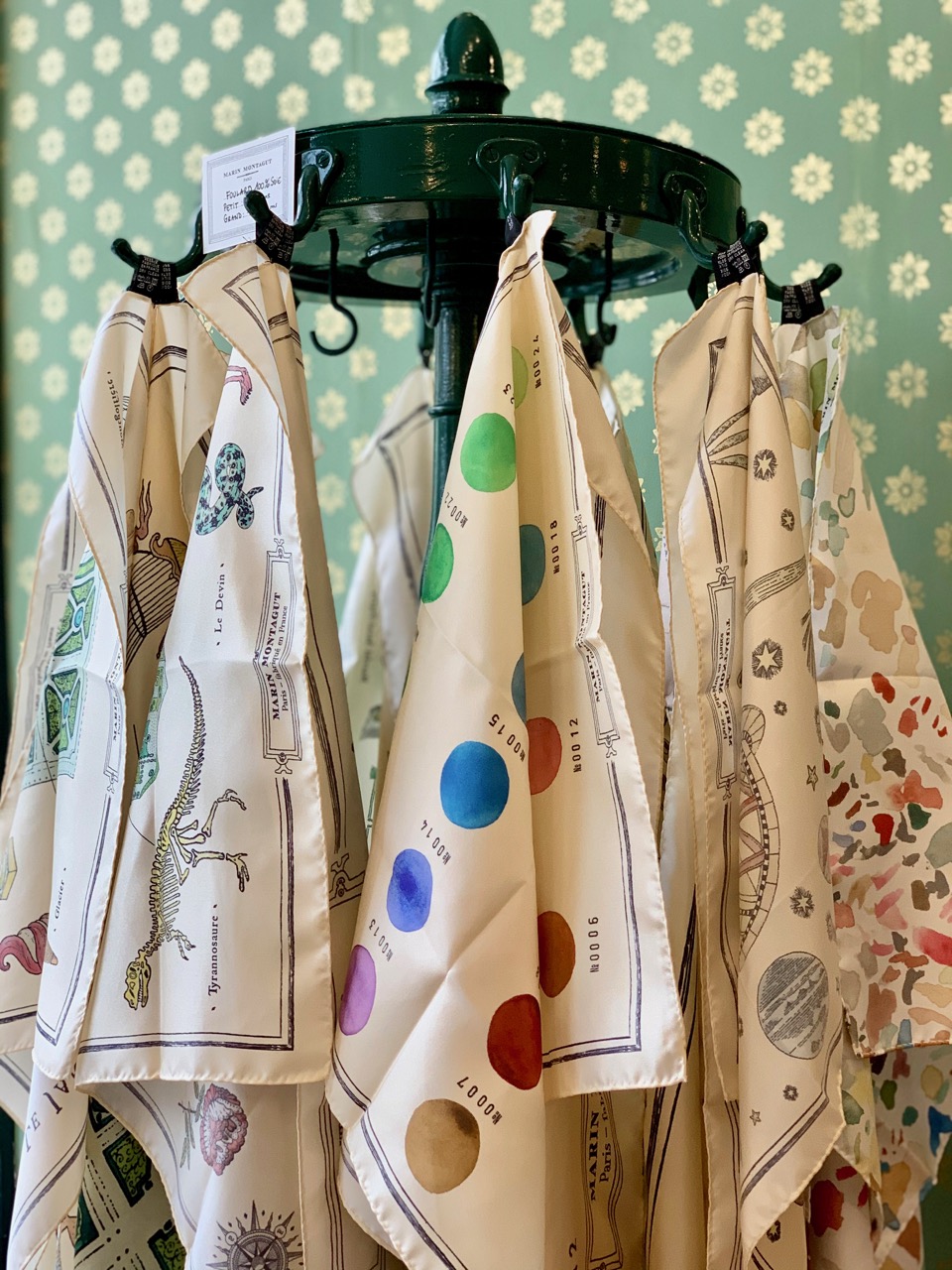Sur les rayonnages, des bougies côtoient de jolies savonnettes délicatement emballées dans du papier de soie. Des foulards de soie roulottés a la main aux délicieux motifs pastels attendent de s’enrouler autour de votre cou…