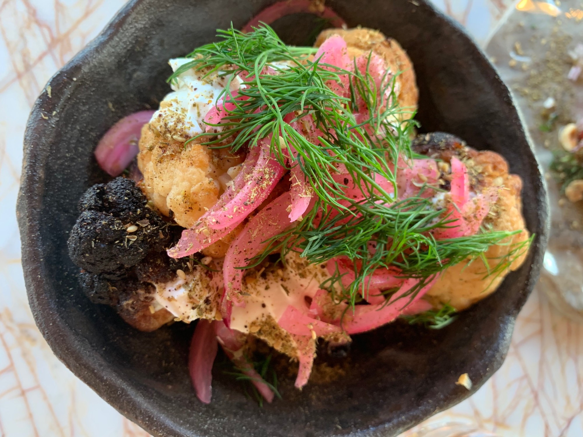 Parfois il est bon de ne pas trop en livrer sur l’expérience vécue, et je ne saurais vraiment décrire le fondant du chou fleur, ou l’alliance parfaite des saveurs et des textures du tartare et de la dorade. Sans parler du côté purement addictif du lieu jaune snacké et de sa baby pita. Désolée, il vous faudra tester par vous même !