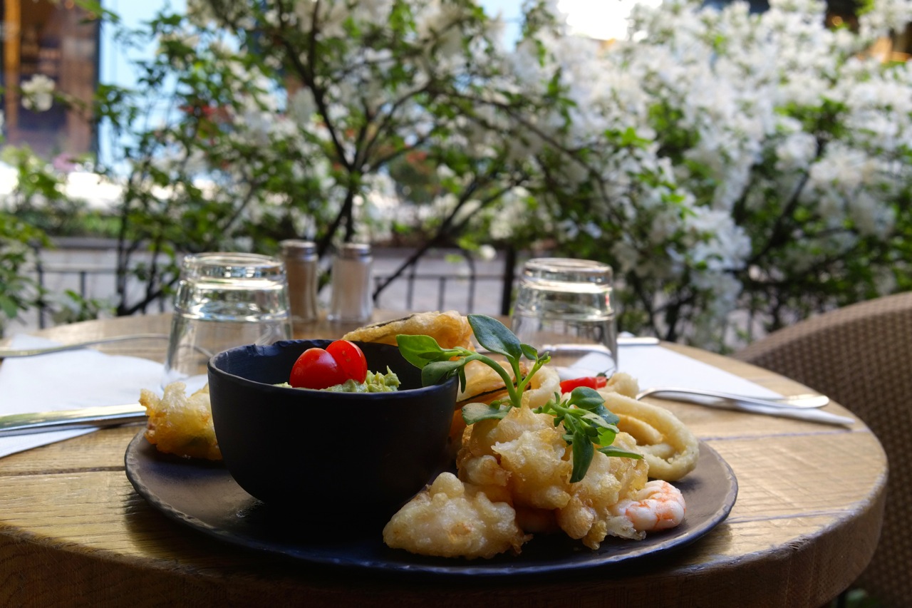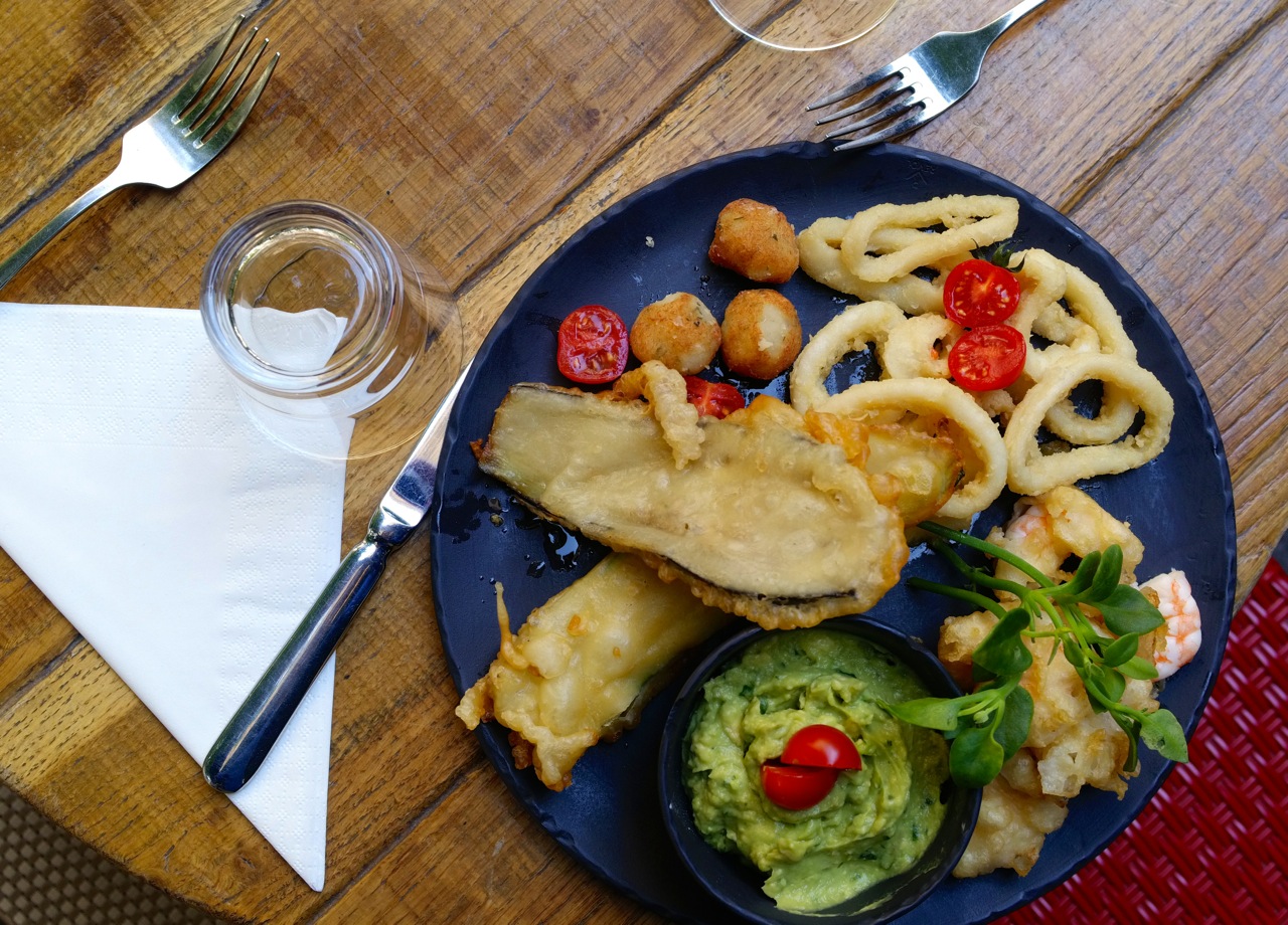 Nous avons commencé par l’antipasti du Trésor à partager, et le ton était donné : un régal. Calamars, crevettes, et tranches d’aubergine, le tout délicieusement frit, accompagné d’un guacamole simplement délicieux.