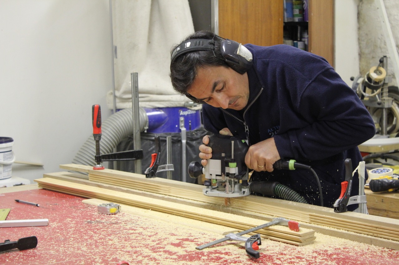 Avec Marine, son bras droit, il vous accueille dans un espace où son bureau jouxte son atelier de fabrication. Il travaille exclusivement avec un outillage électroportatif léger et maniable.