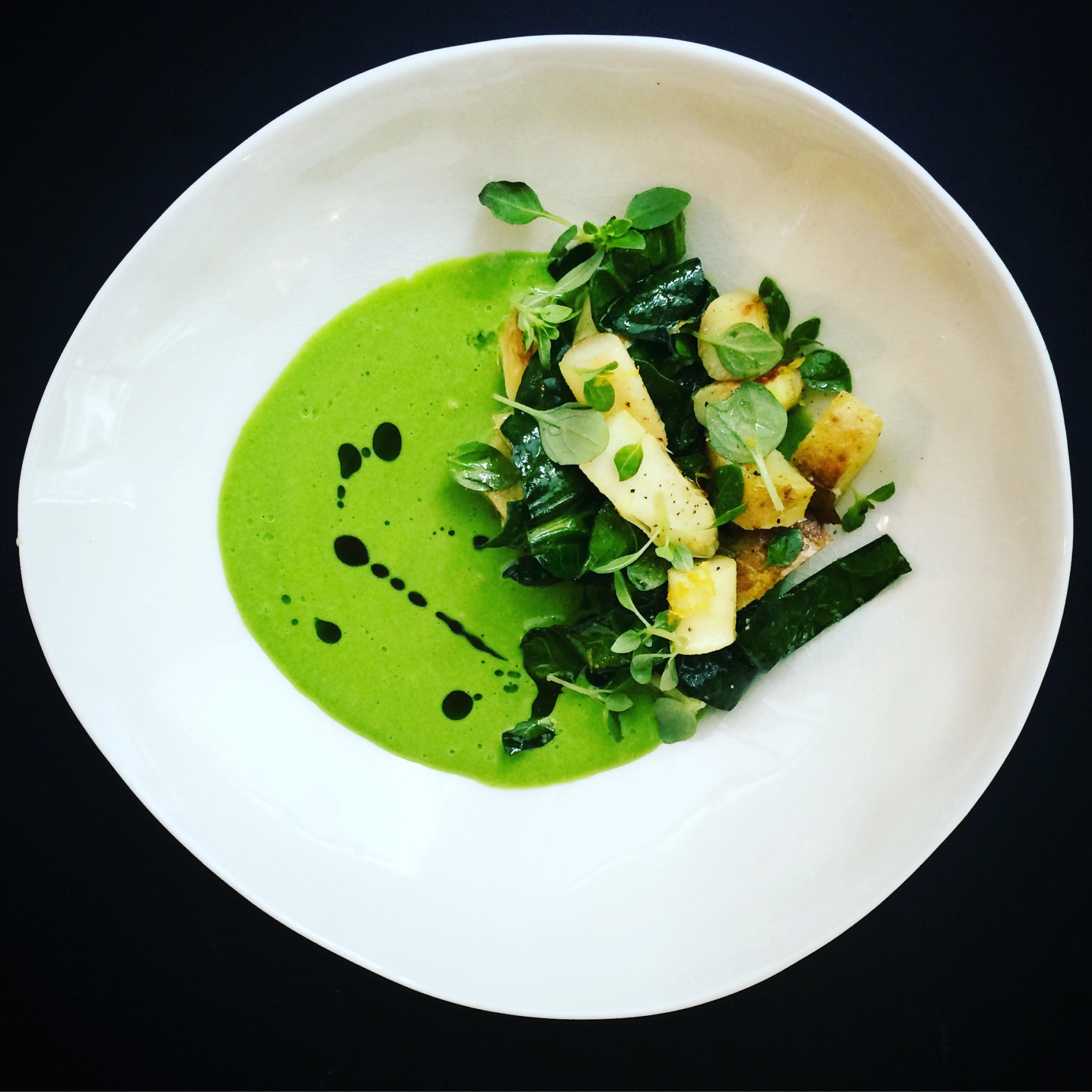 Entrée : Asperge blanche rôtie et pommes de terre nouvelles, velouté de romaine