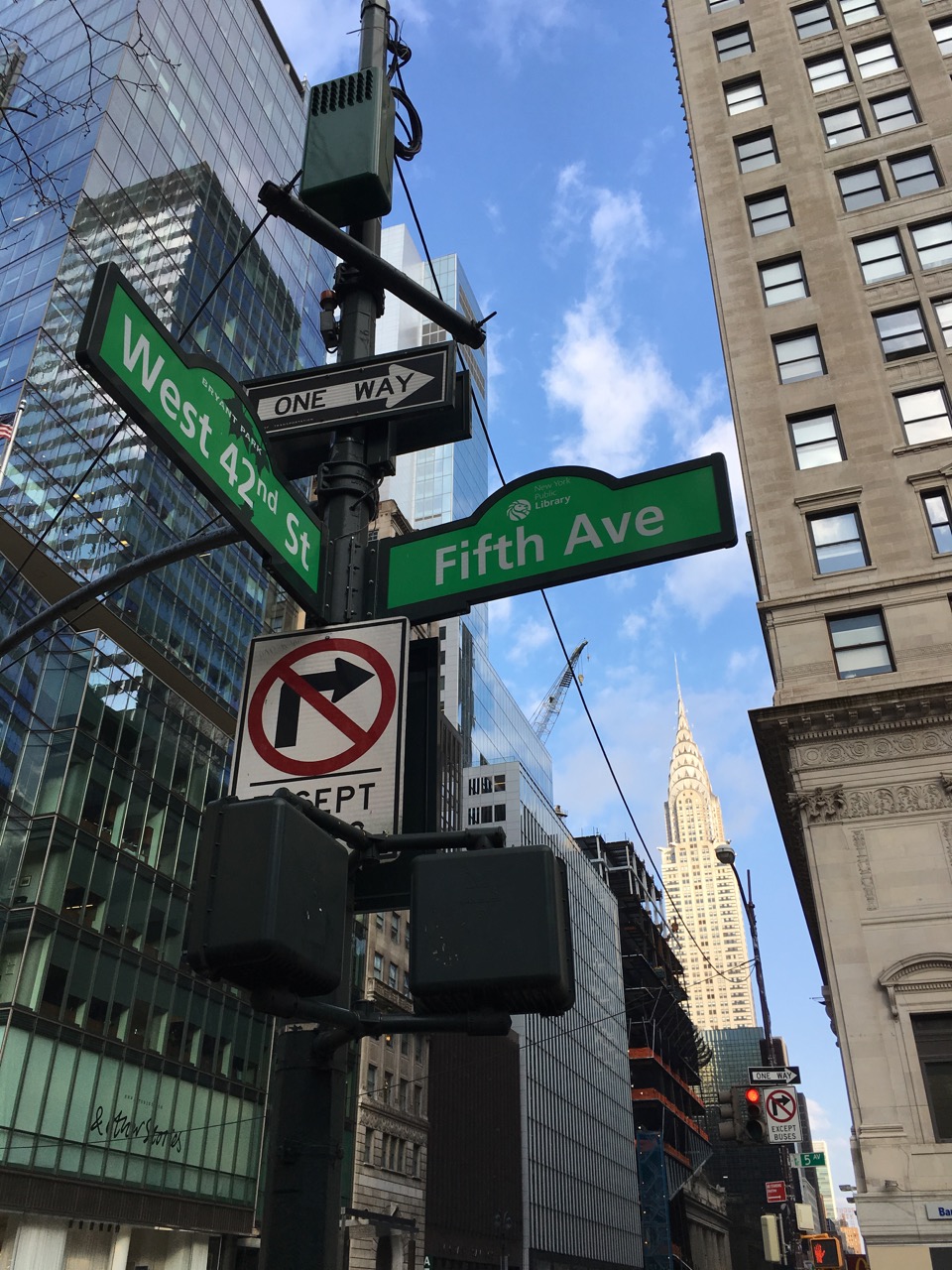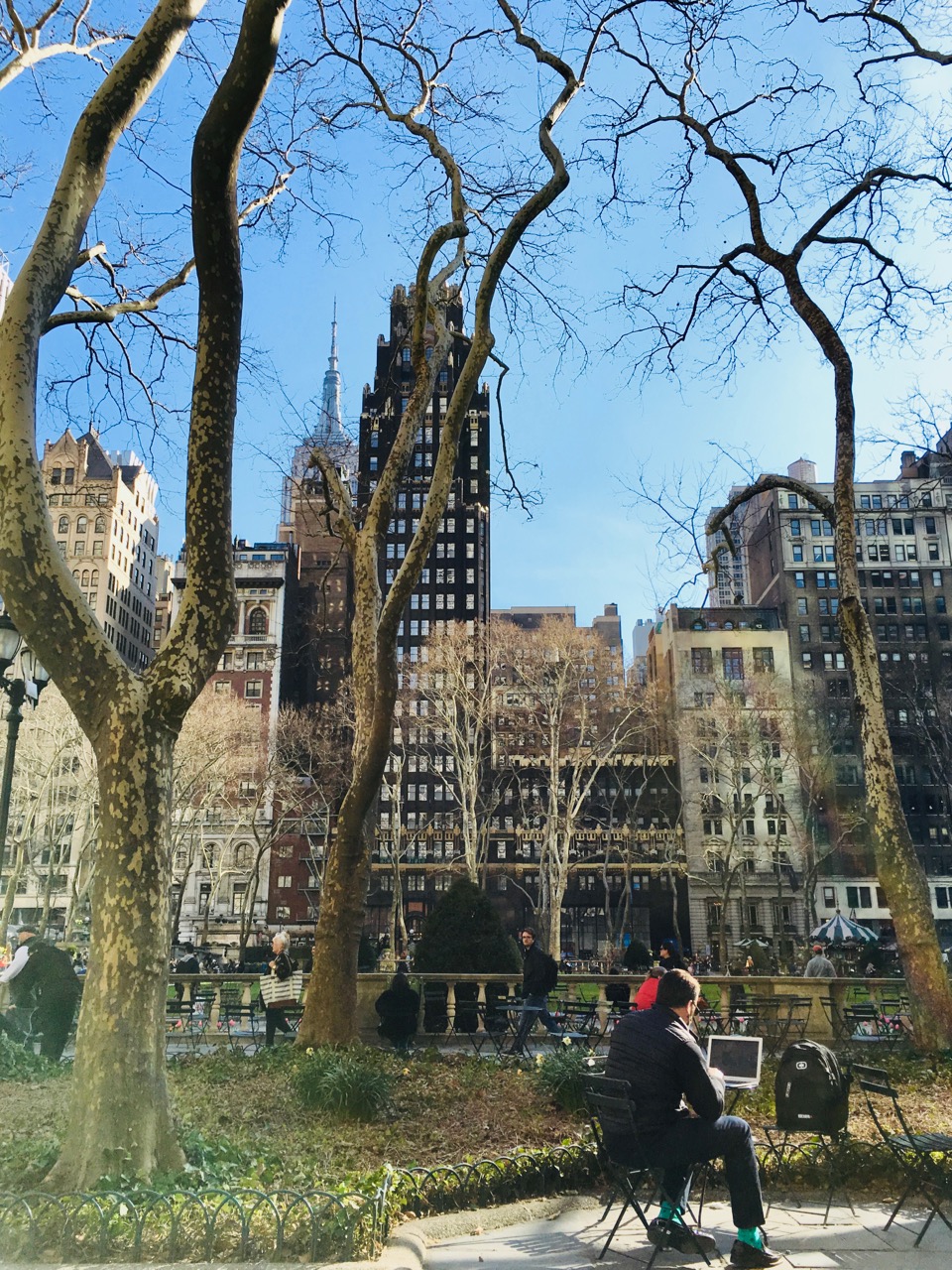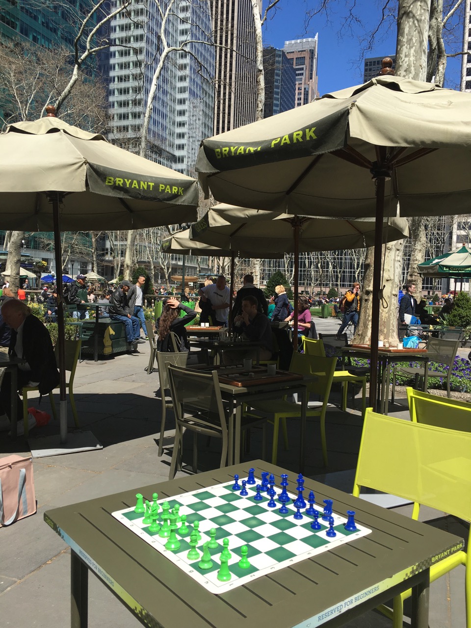 Personnellement commencer un séjour à New York passe par quelques incontournables. Time Square, la cinquième avenue, Central Park en font partie. C’est donc ce que nous avons fait en cette première journée, qui a eu la bonté de nous offrir soleil et douceur dès la descente de l’avion. Et puis il y a Bryant Park, devant la New York Public Library. Ce genre de parc qui n’existe pas à Paris. Des centaines de chaises à disposition, des kiosques pour se désaltérer ou se nourrir, des zones dédiées aux jeux type échecs, dames ou dominos. Un havre de paix au coeur de l’agitation citadine, ouvert du matin jusqu’à la nuit, sans grilles ni portes closes qui en interdiraient l’accès. Les New-Yorkais l’adorent, et moi aussi !