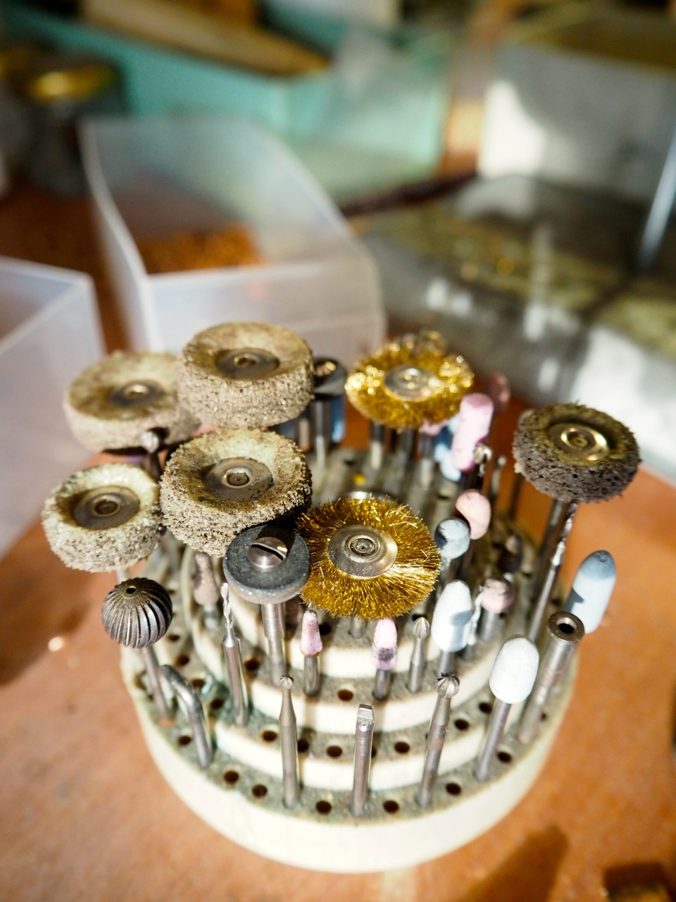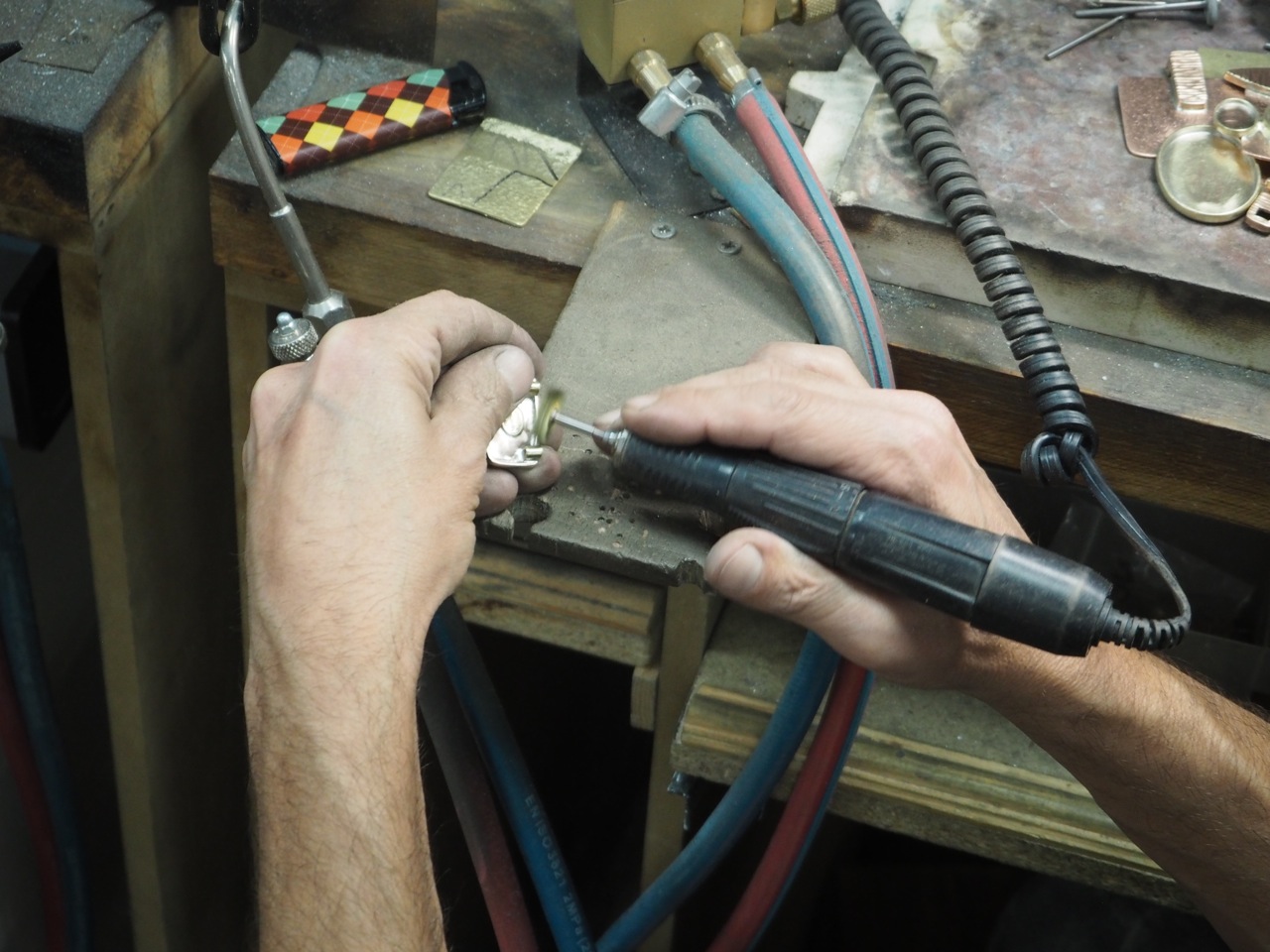 Surprenant de trouver ici, au coeur de la ville, un établi chargé d’outils et de pièces en cours de fabrication. Nous sommes ici bien loin des ateliers obscurs en sous sol, celui ci étant baigné de la lumière de la Place des Victoires.