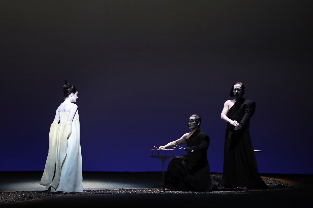 Nous sommes bien loin des costumes traditionnels japonais, des décors réalistes représentant maison, mer et navire. Ici la scène est dépouillée à l’extrême, et la gestuelle des interprètes ainsi que la couleur de leur tenue compensent l’absence de décor.